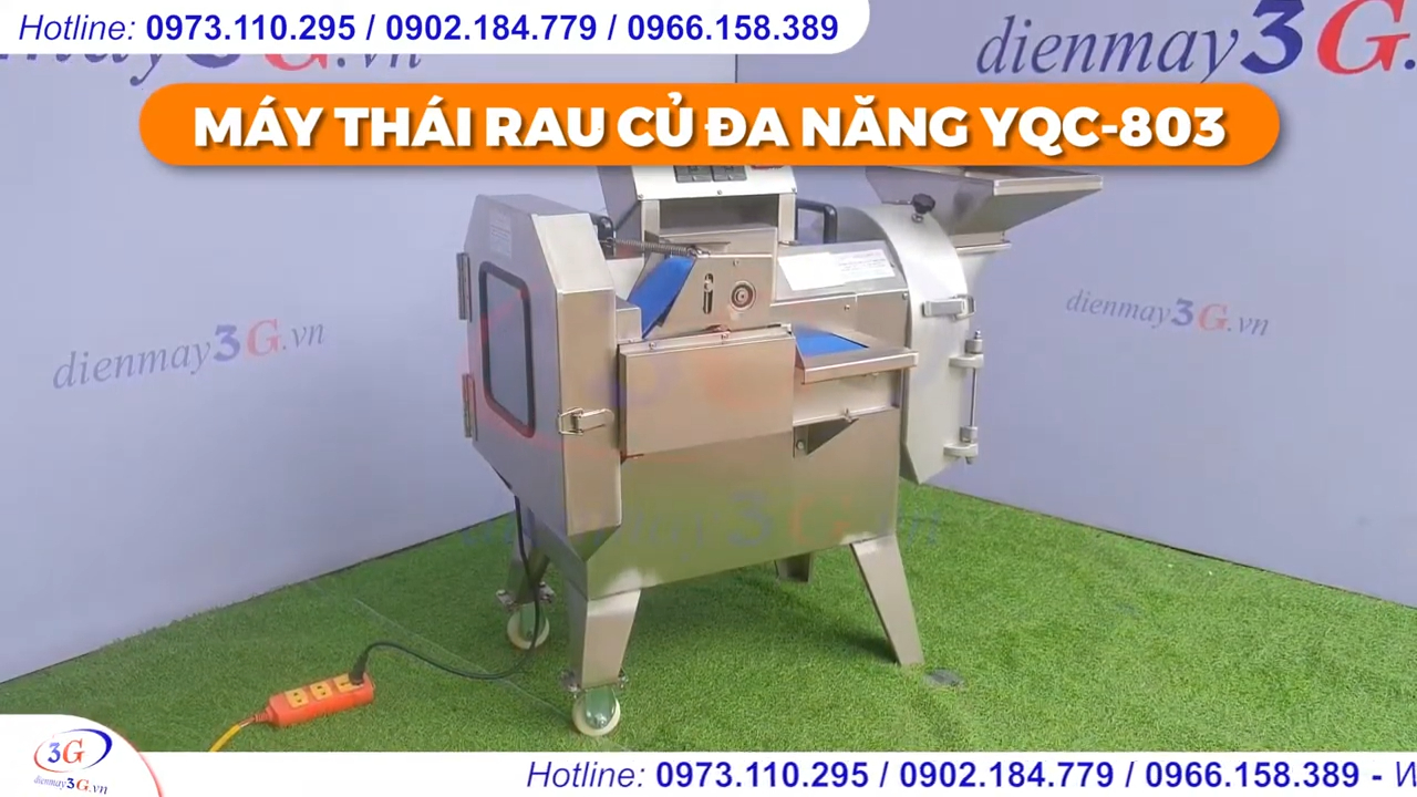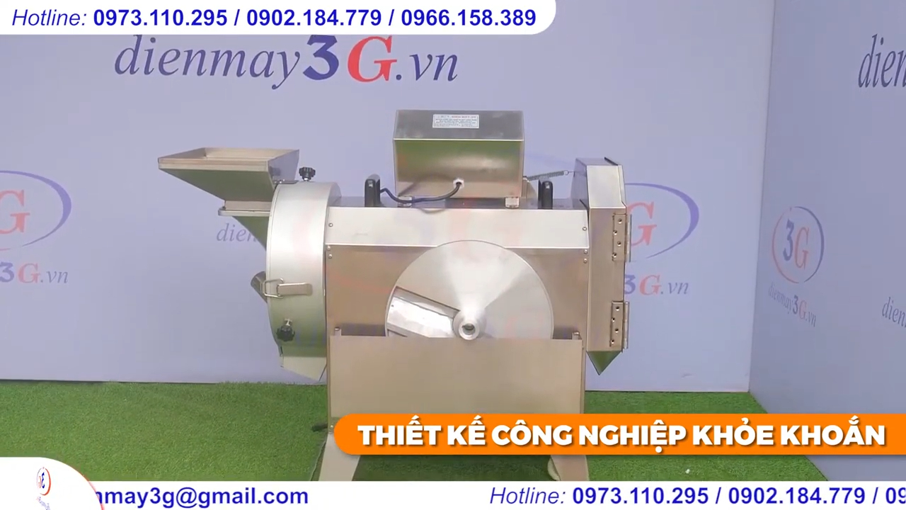 Về cấu tạo, thân máy được làm từ inox chắc chắn, bề mặt sáng bóng và chống gỉ sét. Máy được trang bị bộ điều khiển thông minh gồm bộ biến tần điều chỉnh tần suất hoạt động và công tắc bật tắt tiện lợi. Ngoài ra, máy còn có hệ thống dao thay thế gồm dao thái lát, dao thái sợi và dao thái hạt lựu, giúp người dùng dễ dàng lựa chọn theo nhu cầu chế biến.
