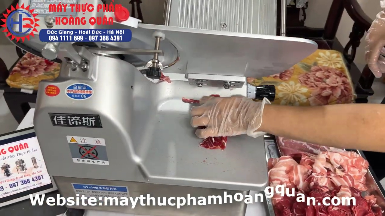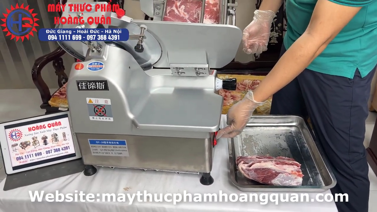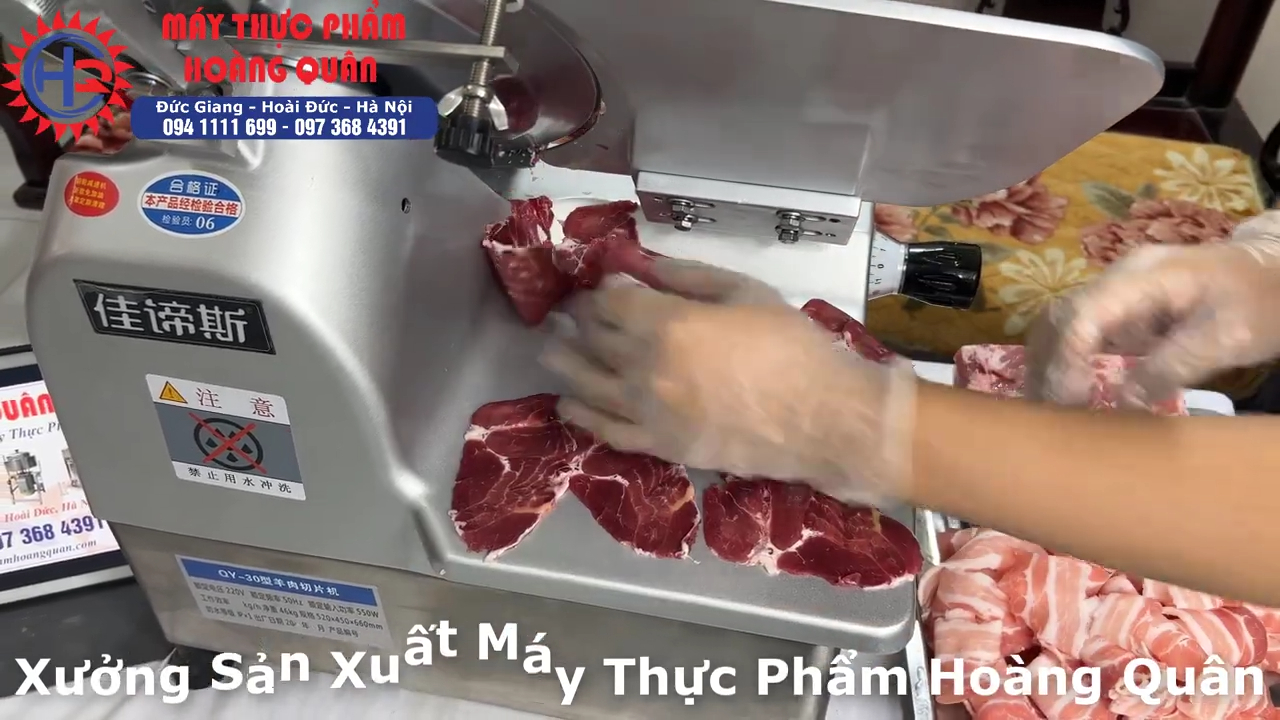 Khi thái thịt ba chỉ đông lạnh hoặc bắp bò đông lạnh, máy cho ra lát thịt mỏng đều và đẹp, rất phù hợp để phục vụ các món lẩu, nướng hoặc bày đĩa trong nhà hàng. Tốc độ của dòng máy này khá nhanh nên trong quá trình thái, người dùng cần liên tục gạt thịt ra khay hoặc đĩa để tránh thịt bị dồn lại quá nhiều. Trong thực tế sử dụng, nếu cần thao tác nhanh thì nên có 2 người làm việc cùng lúc, một người vận hành máy và một người sắp xếp thịt để đạt hiệu quả tốt hơn.