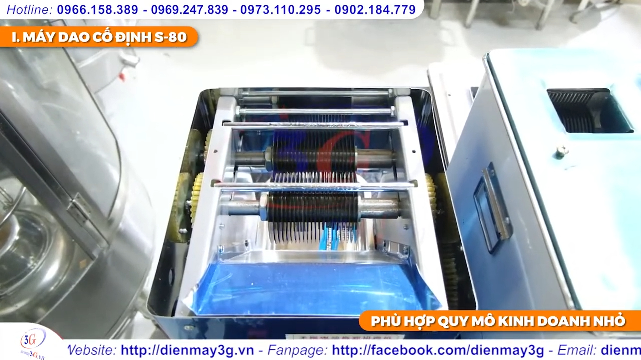 Máy hiện có 3 kích cỡ dao phổ biến, gồm 2mm dùng để thái thịt cho phở, 2,5mm để thái thịt xào, và 3,5mm để thái thịt nướng bún chả. Động cơ của máy có công suất 1,1kW, giúp máy hoạt động mạnh mẽ và khá êm, có thể thái hàng chục kg thịt chỉ trong vài phút, giúp tiết kiệm đáng kể chi phí nhân công cho các quán ăn.
