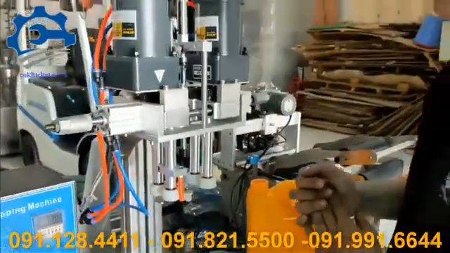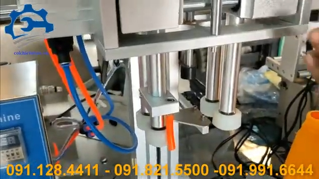 Bây giờ tôi sẽ vận hành thử máy để các bạn xem. Đầu tiên mình đưa chai đã đặt nắp vào vị trí siết. Khi máy hoạt động, hai bánh siết sẽ quay và siết nắp rất chắc và đều. Như các bạn thấy, nắp chai sau khi siết rất chặt và ổn định.