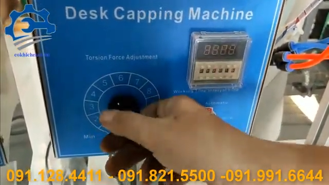 Tiếp theo tôi sẽ giới thiệu sơ qua về bộ điều khiển của máy. Đây là bộ điều khiển dùng để điều chỉnh lực siết mạnh hoặc nhẹ của bánh siết. Bên cạnh đó là timer để điều chỉnh thời gian siết nắp theo nhu cầu sử dụng. Ngoài ra còn có công tắc điều chỉnh hai chế độ hoạt động, bao gồm chế độ siết từng chai hoặc chế độ chạy liên tục.