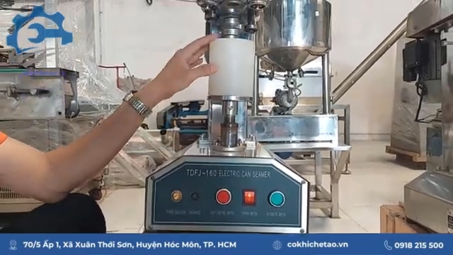Trong quá trình vận hành, người dùng chỉ cần đặt lon vào đúng vị trí khuôn, sau đó đạp bàn đạp một lần, máy sẽ thực hiện quá trình viền mí nắp lon hoàn chỉnh.
