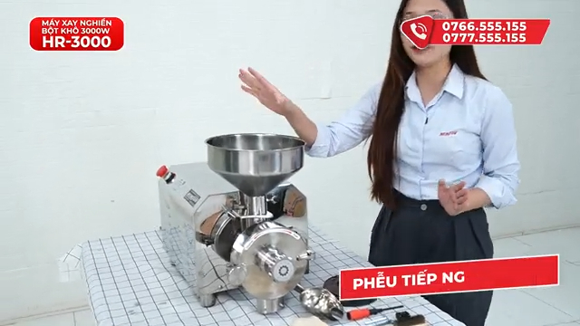 Cổ xả, điều chỉnh độ mịn, phụ kiện và vận hành máy xay nghiền bột khô HR3000