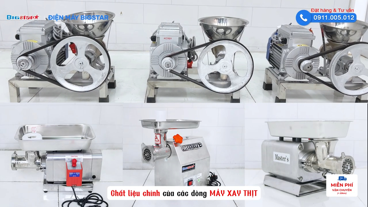 Các dòng máy phổ biến có công suất từ 750W, 1100W, 1500W, 2.2KW đến 3.5KW, tất cả đều sử dụng điện 220V và được thiết kế bằng inox toàn bộ giúp đảm bảo vệ sinh an toàn thực phẩm, độ bền cao và dễ vệ sinh sau khi sử dụng.