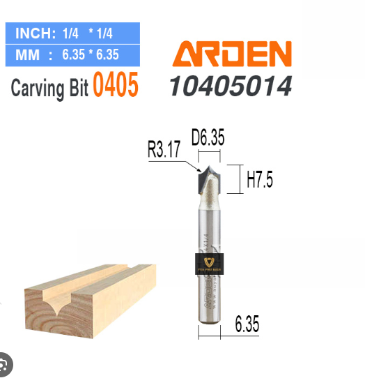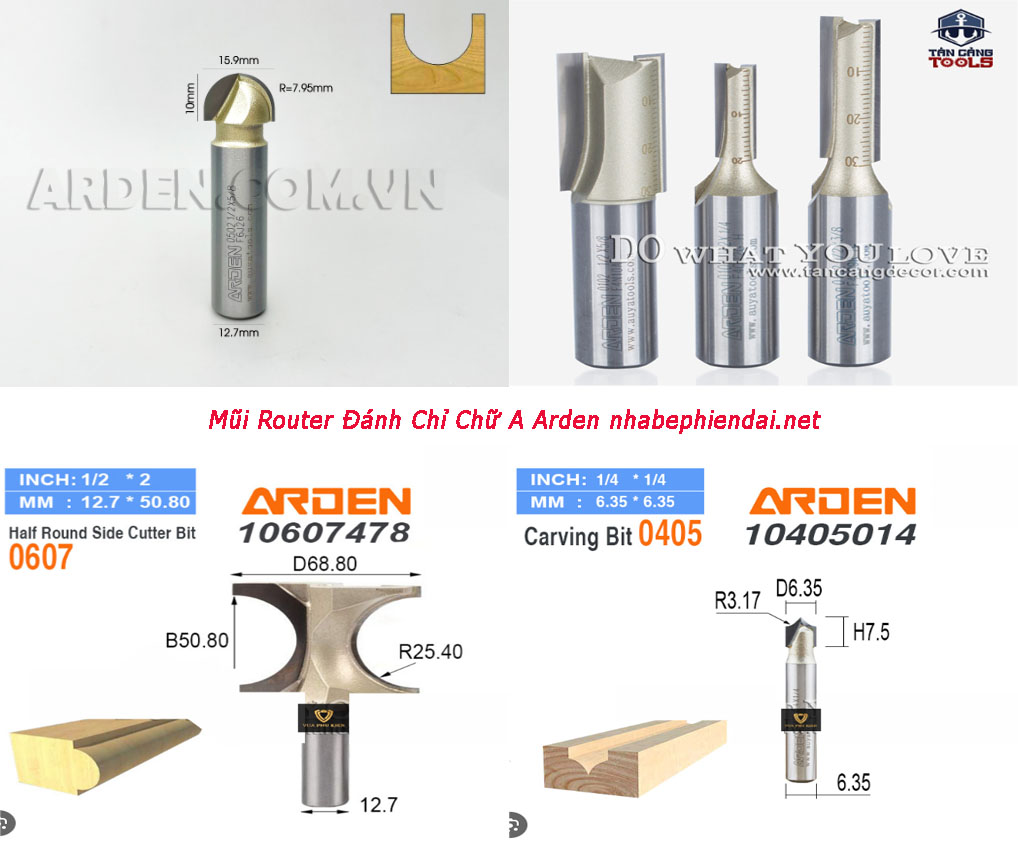 Theo thông tin tôi tìm được, hiện nay trên thị trường chỉ có hai loại mũi router đánh chỉ chữ A Arden có kích thước 35 x 26.88 mm, đó là mũi router có cốt 6.35 mm và cốt 12.7 mm. Giá bán của hai loại mũi router này như sau: