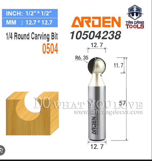 Dưới đây là thông số kỹ thuật của Mũi Router Đánh Chỉ Chữ S Arden R6.35 x R9.52 mm Cốt 12.7 mm: