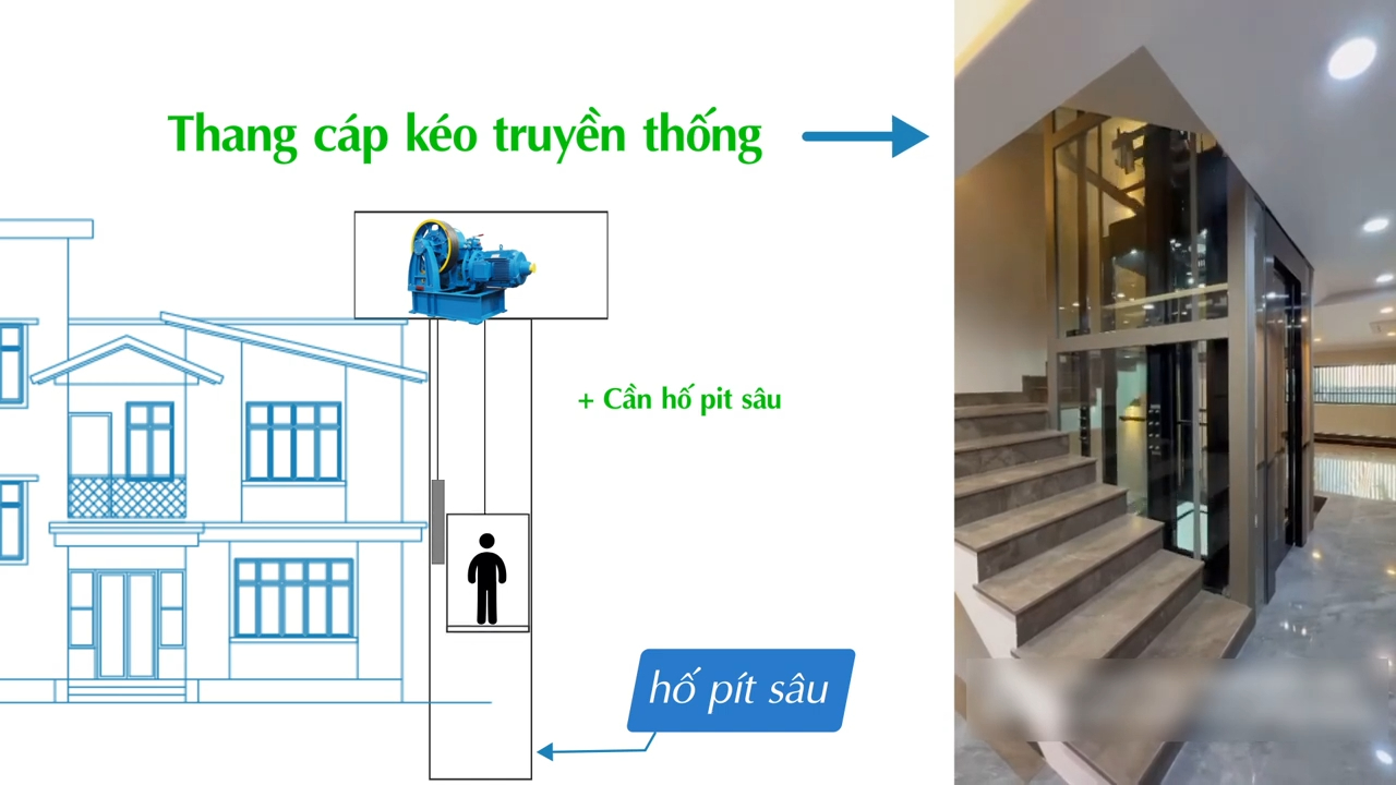 Một lợi thế khác của dòng thang này là thiết kế vách kính dày khoảng 10mm kết hợp máy kéo nhỏ gọn giúp giảm chiều cao tầng trên cùng OH mang lại tính thẩm mỹ cao cho khu vực tầng thượng đồng thời tạo cảm giác không gian mở hiện đại cho toàn bộ công trình nhà phố.
