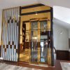 Tuy nhiên khi bên ngoài đã sử dụng nhiều inox gương vàng thì bên trong cabin nên tiết chế lại để tránh cảm giác rối mắt. Nếu toàn bộ bên trong đều dùng inox gương vàng hoa văn thì thang sẽ khá nặng và nhiều người nhận xét là nhìn hơi “quê”. Vì vậy ở công trình này tôi đã tư vấn cho chủ nhà sử dụng tấm vách sau là inox gương vàng làm điểm nhấn, còn hai bên vách cabin kết hợp inox gương trắng và inox sọc nhuyễn. Cách phối này giúp cabin nhìn sáng hơn, thoáng hơn và cảm giác không gian rộng hơn.
