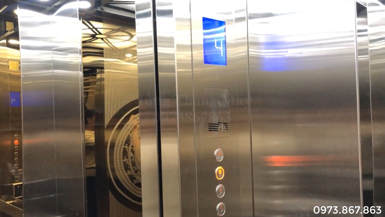 Cửa cabin sử dụng inox gương trắng, khi nhìn vào sẽ giống như một tấm gương phản chiếu, vừa tạo cảm giác rộng rãi vừa tiện cho việc soi gương hoặc chỉnh trang. Bảng hiển thị tầng sử dụng màn hình LCD cho 5 tầng, hiển thị rõ ràng vị trí thang và tầng đang dừng.