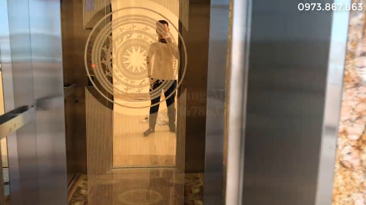 Quay lại khu vực các tầng dưới, mặt cửa thang máy ở các tầng đều sử dụng cùng một loại đá và inox gương vàng hoa văn để tạo sự đồng bộ. Phần hiển thị LCD cũng giúp khu vực cửa thang nhìn hiện đại và thẩm mỹ hơn.