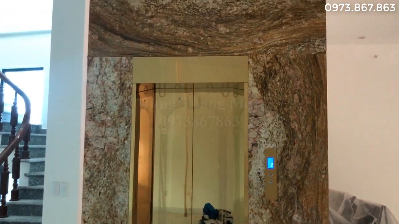 Ở khu vực bên ngoài thang máy, chủ nhà sử dụng đá tự nhiên ốp mặt ngoài kết hợp với inox gương vàng hoa văn. Phần hiển thị tầng sử dụng màn hình LCD giúp tổng thể thang máy nhìn sang trọng và hiện đại hơn. Mặt đá tự nhiên kết hợp với inox gương vàng tạo cảm giác hài hòa và nổi bật cho khu vực thang máy.