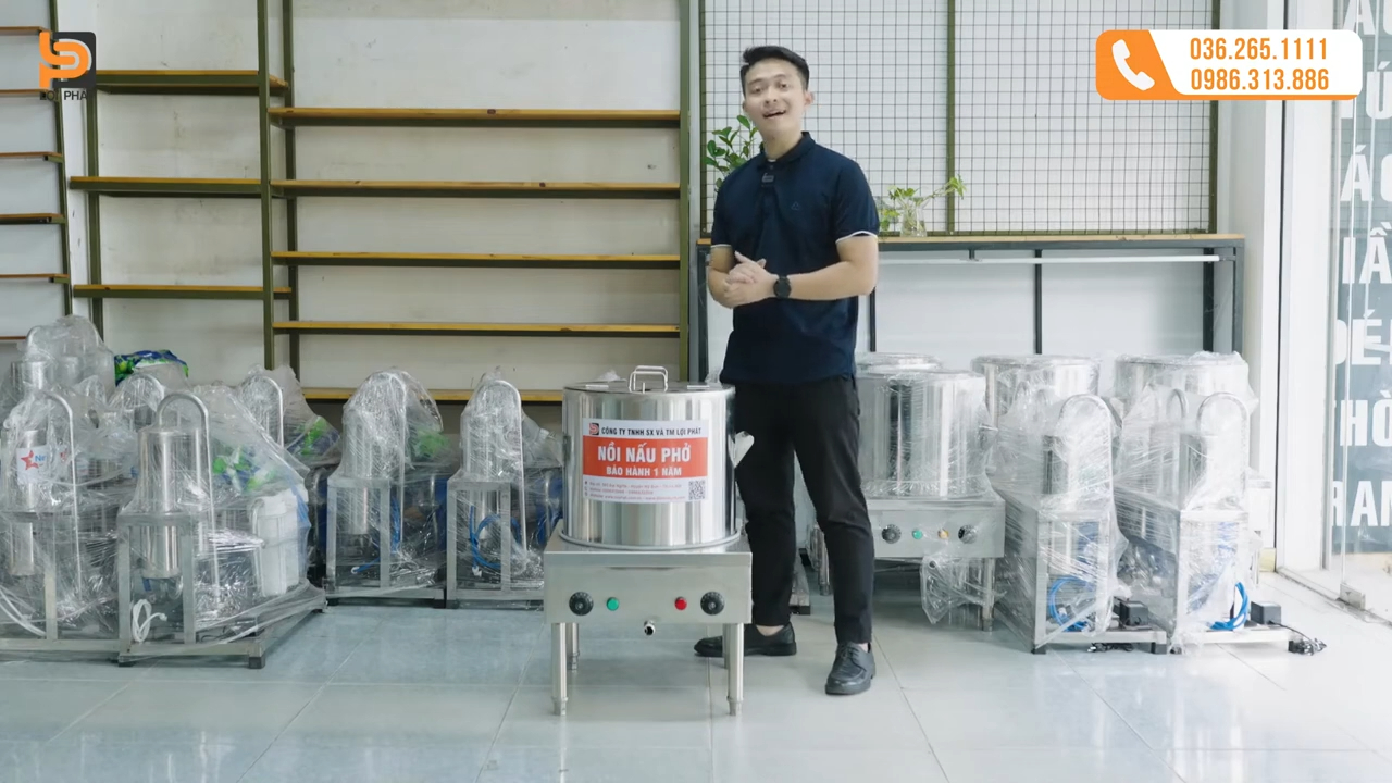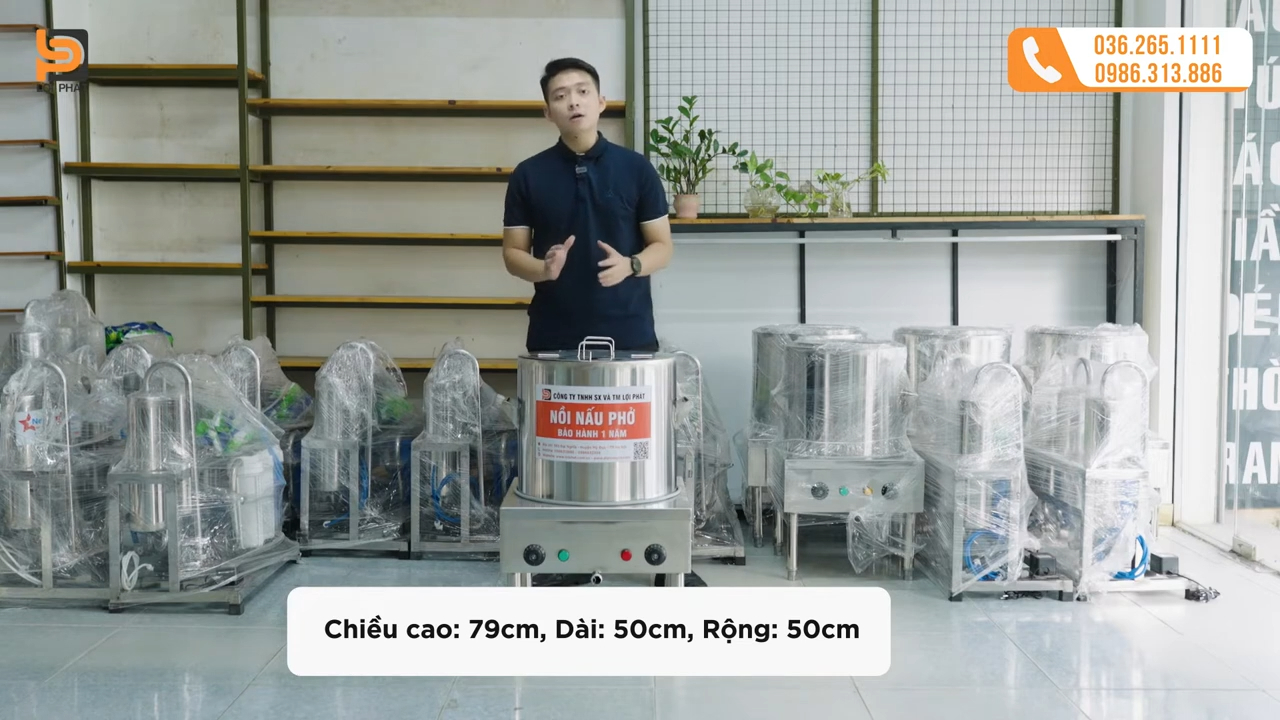 Trước mặt quý vị là nồi nấu phở điện 50 lít, thiết bị được thiết kế bằng inox cao cấp sáng bóng, bề mặt dễ vệ sinh và đảm bảo an toàn vệ sinh thực phẩm trong quá trình nấu nước dùng, nhờ vậy nồi có thể sử dụng lâu dài mà vẫn giữ được độ bền và tính thẩm mỹ trong khu bếp của quán ăn.