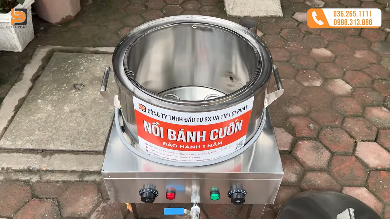phía dưới nồi được thiết kế van xả nước tiện lợi, sau khi tráng bánh xong người dùng chỉ cần mở van để xả nước ra ngoài và vệ sinh nồi nhanh chóng, ngoài ra nồi còn được trang bị chân đế chắc chắn giúp đặt nồi ổn định trên mặt bàn, đảm bảo an toàn khi sử dụng và thuận tiện cho các hộ kinh doanh bánh cuốn hoặc bánh ướt.