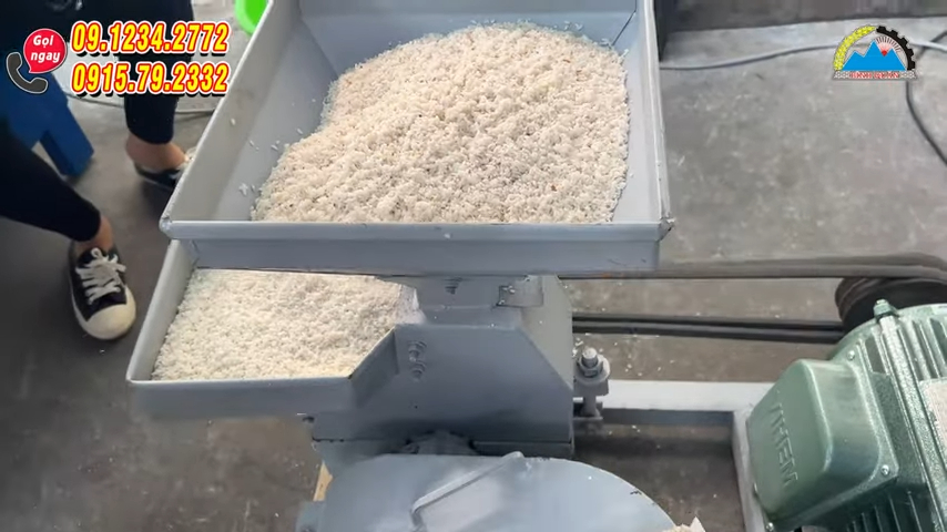 Trước khi vận hành máy, nguyên liệu chính là gạo sẽ được ngâm mềm rồi đưa vào máy nghiền để nghiền thành bột ẩm. Trong quá trình nghiền, gạo được xử lý để tạo ra dạng bột có độ ẩm phù hợp, sau đó kỹ thuật viên sẽ kiểm tra bằng cách nắm chặt bột trong tay, nếu bột kết dính nhẹ nhưng vẫn tơi là đạt yêu cầu để đưa sang công đoạn tiếp theo.