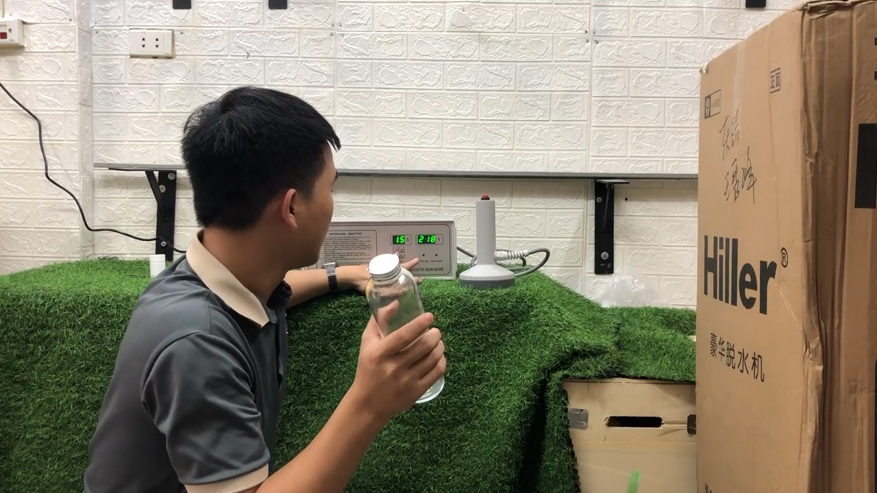 Tiếp theo mình sẽ thử dán seal với chai thủy tinh để các bạn dễ dàng quan sát. Với loại chai này, nắp bằng kim loại nên chúng ta sẽ đặt trực tiếp miếng seal nhôm lên miệng chai, sau đó đặt nắp lên trên rồi dùng máy để dán. Thời gian dán sẽ được giảm xuống khoảng từ 0,5 đến 1,5 giây để phù hợp với chất liệu. Sau khi thực hiện xong, lớp seal nhôm cũng được dán rất chắc chắn và đảm bảo độ kín cho sản phẩm. Như vậy có thể thấy máy dán màng seal nhôm cầm tay DGIF 500A hoạt động rất hiệu quả, giúp việc đóng gói chai lọ trở nên nhanh chóng, tiện lợi và đảm bảo chất lượng sản phẩm.