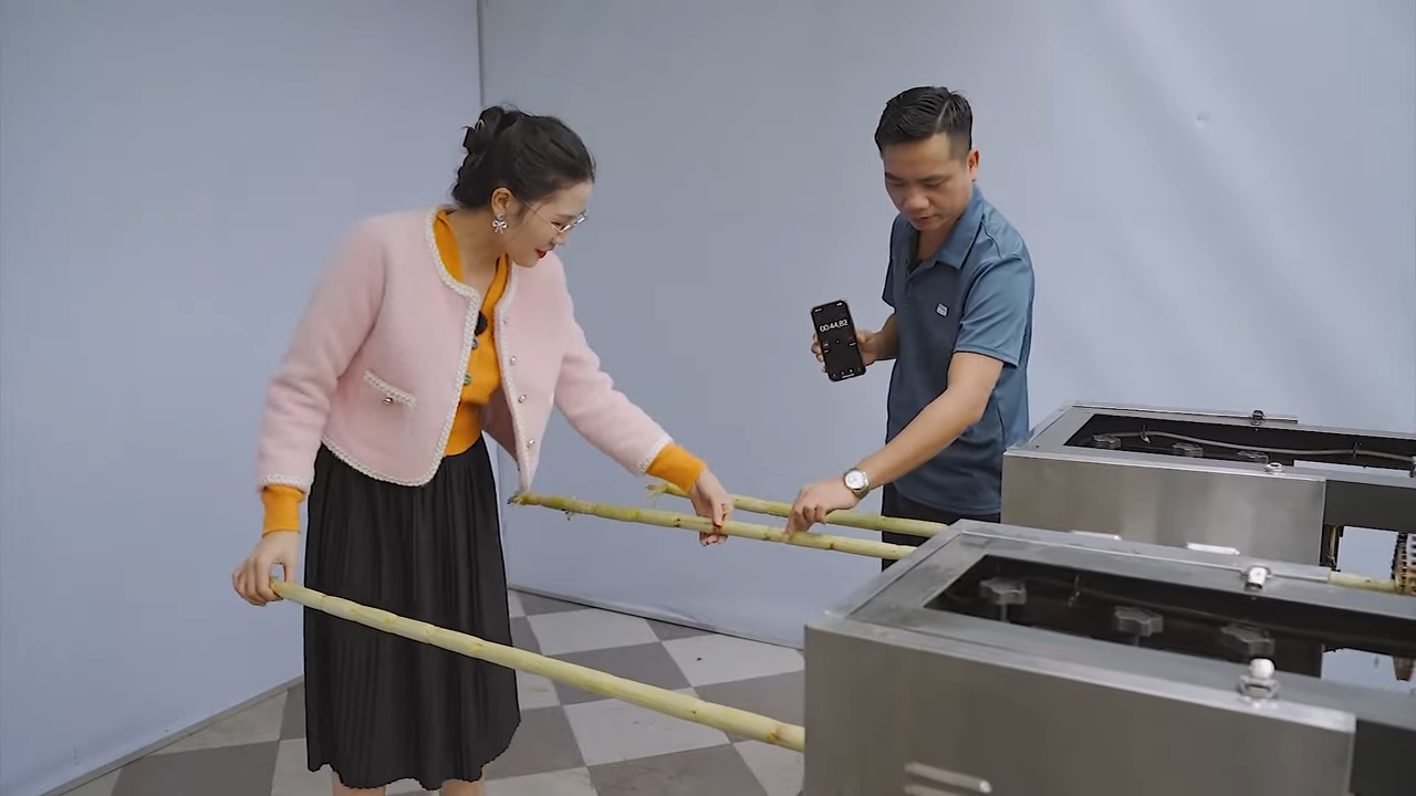 Bây giờ chúng ta sẽ bắt đầu thử nghiệm thực tế với những cây mía dài khoảng 2 mét. Khi đưa mía vào máy, chỉ mất khoảng 50 giây để bào xong một cây mía dài 2 mét. Điều đặc biệt là cây mía sau khi bào khô ráo, sạch và không bị dập nước.