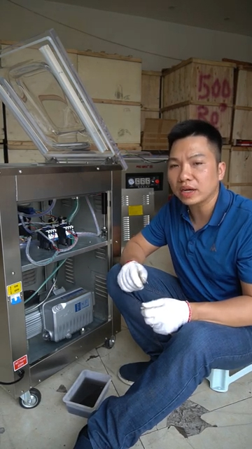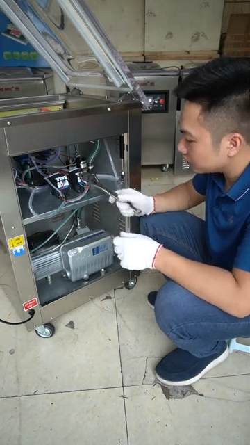 Khi mở máy hút chân không ra, bạn sẽ thấy máy được chia thành hai phần rõ ràng. Phần phía trên là hệ thống điều khiển của máy, phần phía dưới là khu vực đặt động cơ – bộ phận quan trọng nhất, quyết định toàn bộ quá trình hút chân không.