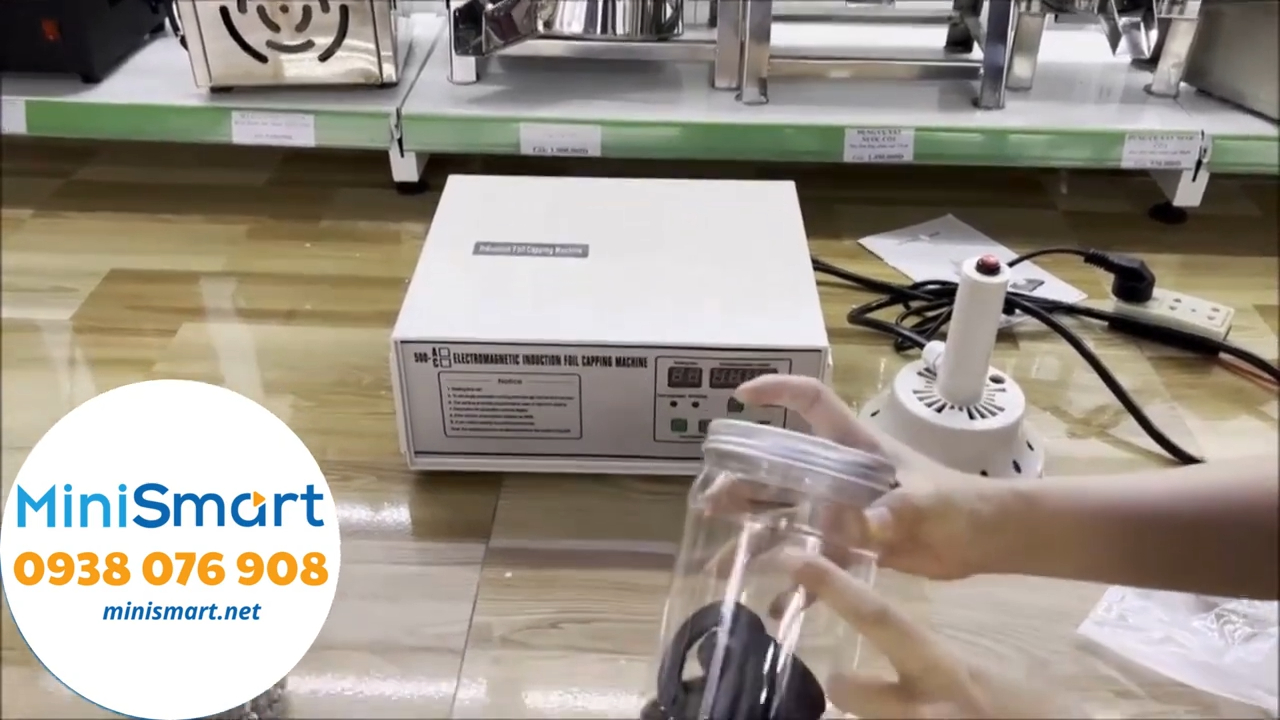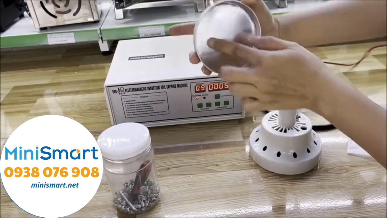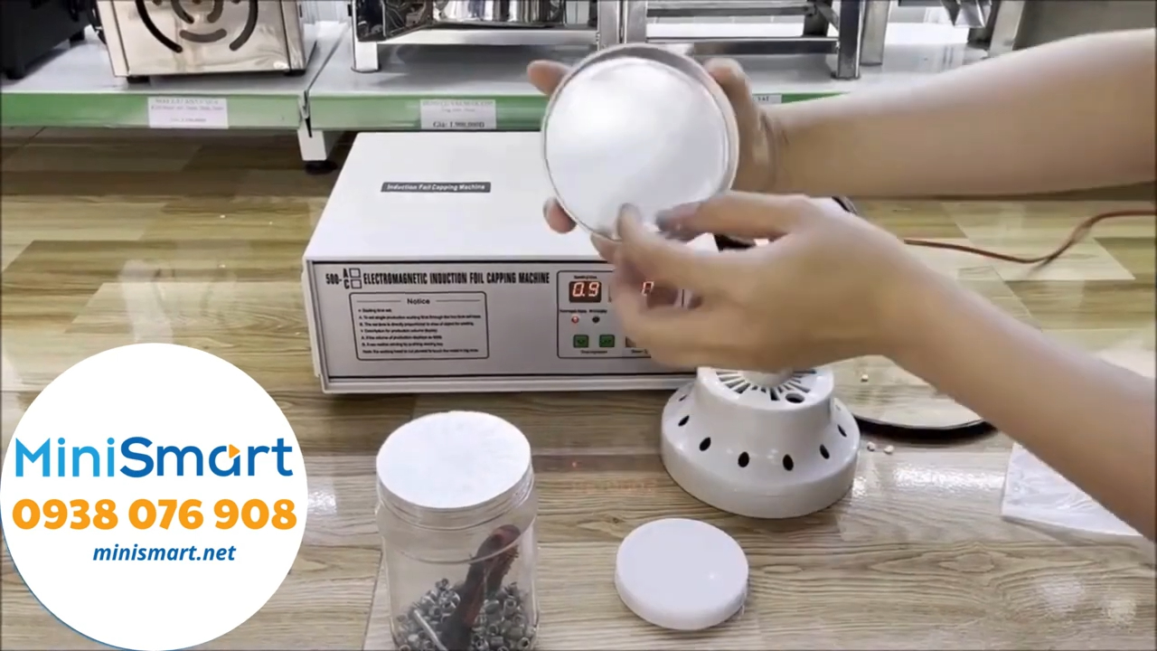 Đầu tiên cho miếng màng seal vào bên trong nắp, sau đó vặn chặt nắp vào miệng hũ. Tiếp theo đặt đầu dán của máy lên trên nắp và giữ khoảng vài giây theo mức đã cài đặt, ví dụ ở đây để khoảng 0,5 giây. Sau khi nhấc máy ra thì màng seal đã dính chặt vào miệng hũ.