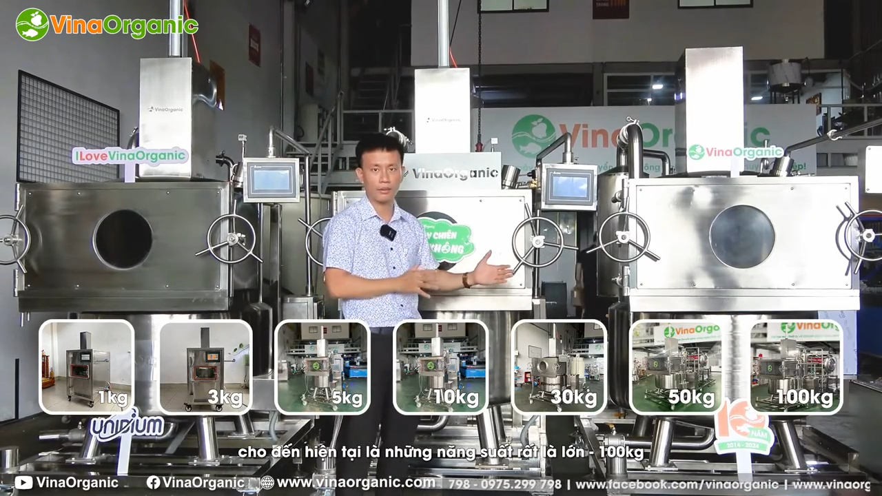 Hệ thống máy chiên chân không và những ưu điểm nổi bật của dòng máy này trong sản xuất thực phẩm. Trong hệ thống máy chiên chân không hiện nay có rất nhiều model với công suất khác nhau. Có những dòng máy nhỏ như máy 1kg dùng cho phòng thí nghiệm hoặc nghiên cứu sản phẩm. Bên cạnh đó là các model lớn hơn như máy 20kg, máy 30kg và nhiều dòng công suất lớn khác phục vụ cho sản xuất thực phẩm quy mô công nghiệp. Việc đa dạng về công suất giúp các cơ sở sản xuất dễ dàng lựa chọn thiết bị phù hợp với quy mô và nhu cầu chế biến của mình.