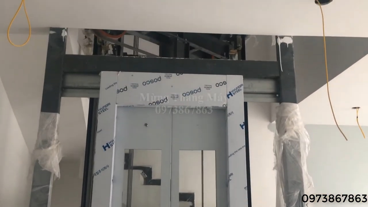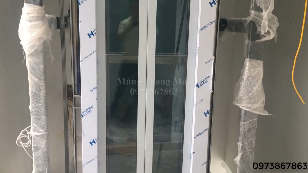 Ở phần cửa thang, chúng ta có thể thấy vị trí đầu cửa được lắp đặt theo phương ngang để tạo sự gọn gàng và thẩm mỹ. Nếu tính theo kích thước phổ biến của dòng thang này thì khung thang sẽ chiếm khoảng 10 cm mỗi bên. Sau khi trừ phần khung thì chiều rộng cửa còn khoảng 700 mm.