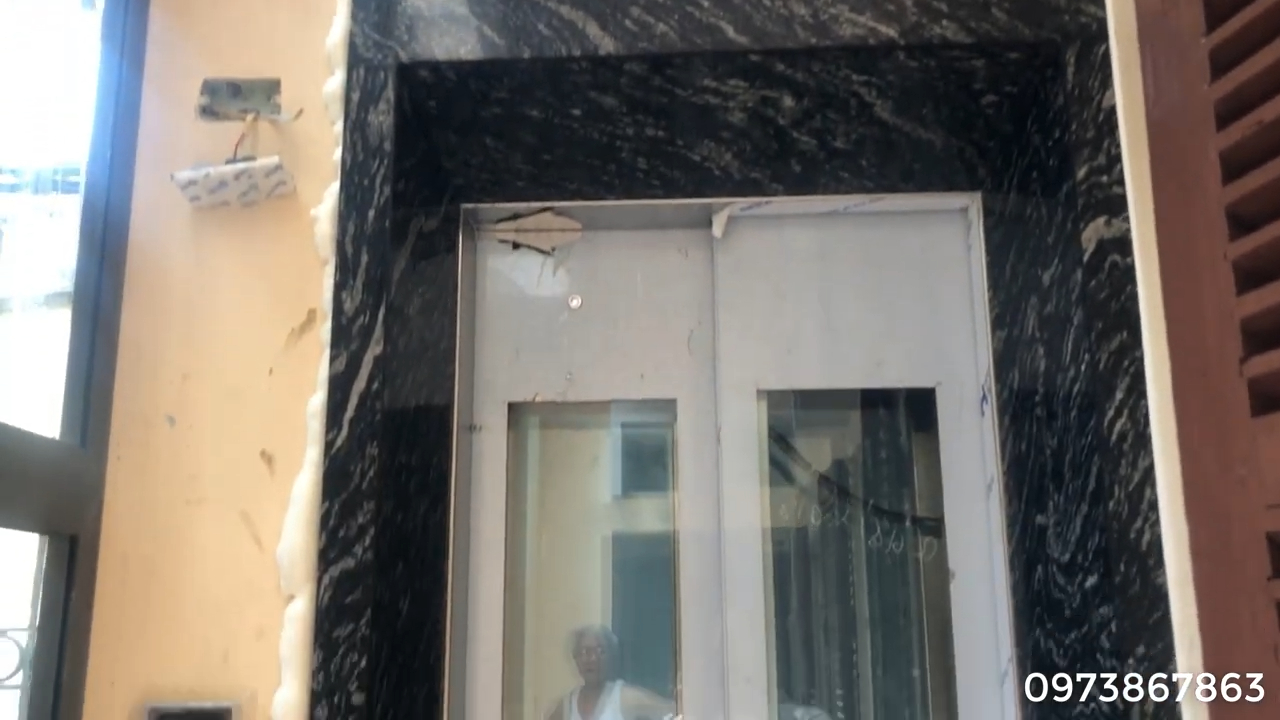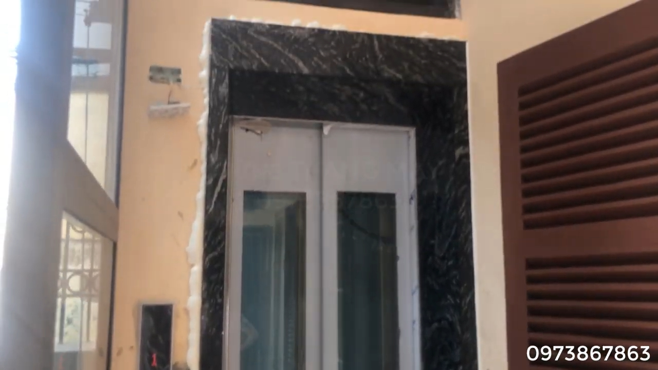 Ở phía trước là cửa tầng của thang máy. Hiện tại công trình vừa hoàn thiện nên vẫn chưa bóc lớp giấy bảo vệ và cũng chưa vệ sinh hoàn toàn. Phần sàn đá trước cửa thang đã được chủ nhà hoàn thiện, đồng thời bơm thêm keo silicon vào các khe tiếp giáp giữa đá và tường để đảm bảo độ kín và tăng tính thẩm mỹ. Sau này khi toàn bộ ngôi nhà hoàn thiện, chủ nhà sẽ sơn lại toàn bộ tường, bao gồm cả khu vực thang máy để đồng bộ màu sắc với thiết kế chung.