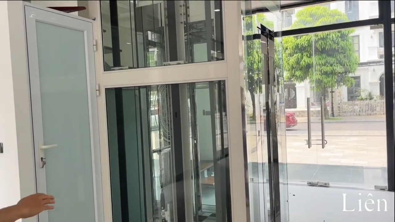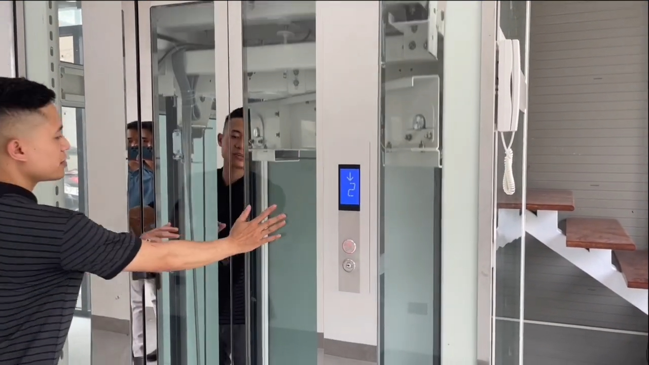 Với thiết kế này thì kích thước hố thang được bố trí khoảng 1m4 x 1m4, cửa thang có kích thước khoảng 650mm và chiều cao cửa khoảng 2m1, đây là dạng cửa mở tim hai cánh giúp tối ưu không gian sử dụng, còn phần cabin thang máy được thiết kế kích thước khoảng 1m x 800mm, phù hợp cho nhu cầu sử dụng của gia đình từ 3–5 người, hai bên vách cabin sử dụng kính cường lực để tạo cảm giác không gian rộng rãi và thoáng hơn khi đứng bên trong cabin, vì cabin có chiều rộng khoảng 800mm nên việc bố trí hai vách kính giúp người sử dụng không cảm thấy chật hẹp khi di chuyển.