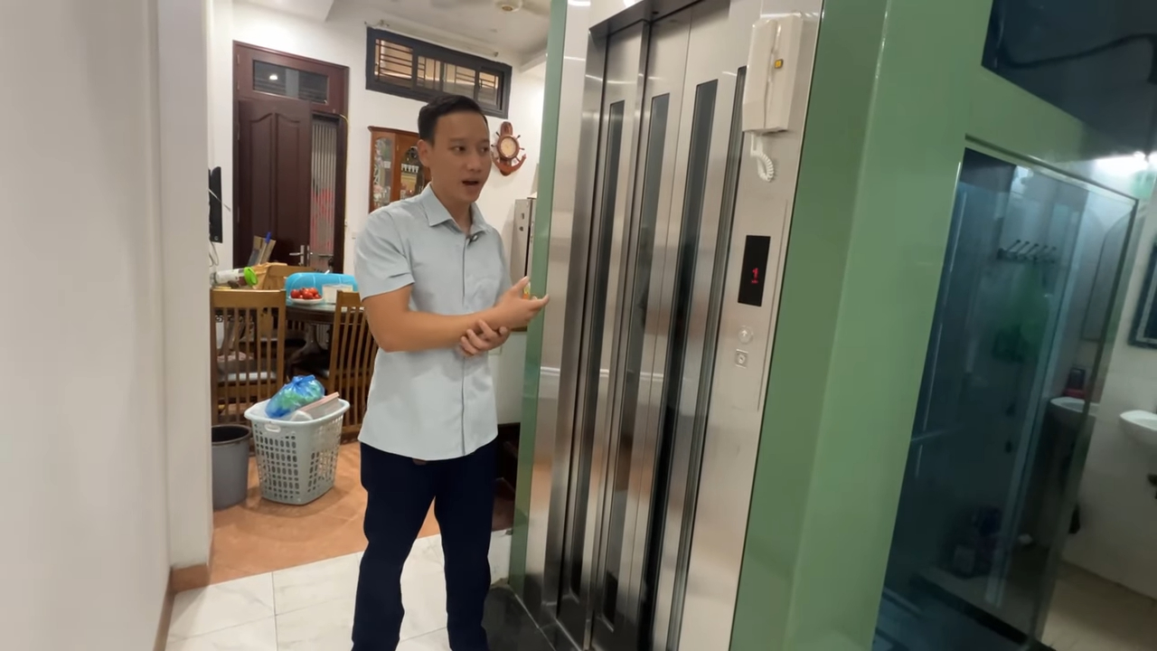 Một điểm nổi bật của công trình là hệ thống cửa mở tự động 4 cánh dạng mở tim. Với chiều ngang hố thang chỉ khoảng 1.17m, nếu sử dụng cửa 2 cánh thông thường thì lối ra vào sẽ khá hẹp. Thiết kế cửa 4 cánh giúp tăng độ mở thông thủy lên khoảng 65cm, đủ rộng để di chuyển máy giặt, xe đẩy hoặc bê mâm cơm một cách thuận tiện. Đây là giải pháp rất hiệu quả cho các gia đình có không gian cầu thang hạn chế. Bên cạnh yếu tố kỹ thuật, thang máy kính khung thép còn mang lại giá trị thẩm mỹ cao cho ngôi nhà. Toàn bộ hệ khung được sơn tĩnh điện màu xanh ngọc đồng bộ với hệ nẹp sập, tạo nên tổng thể kiến trúc hài hòa. Phần vách kính sử dụng kính an toàn màu xanh da trời giúp không gian luôn thông thoáng, tận dụng được ánh sáng tự nhiên và tạo cảm giác nhẹ nhàng khi đặt giữa khu vực thang bộ.