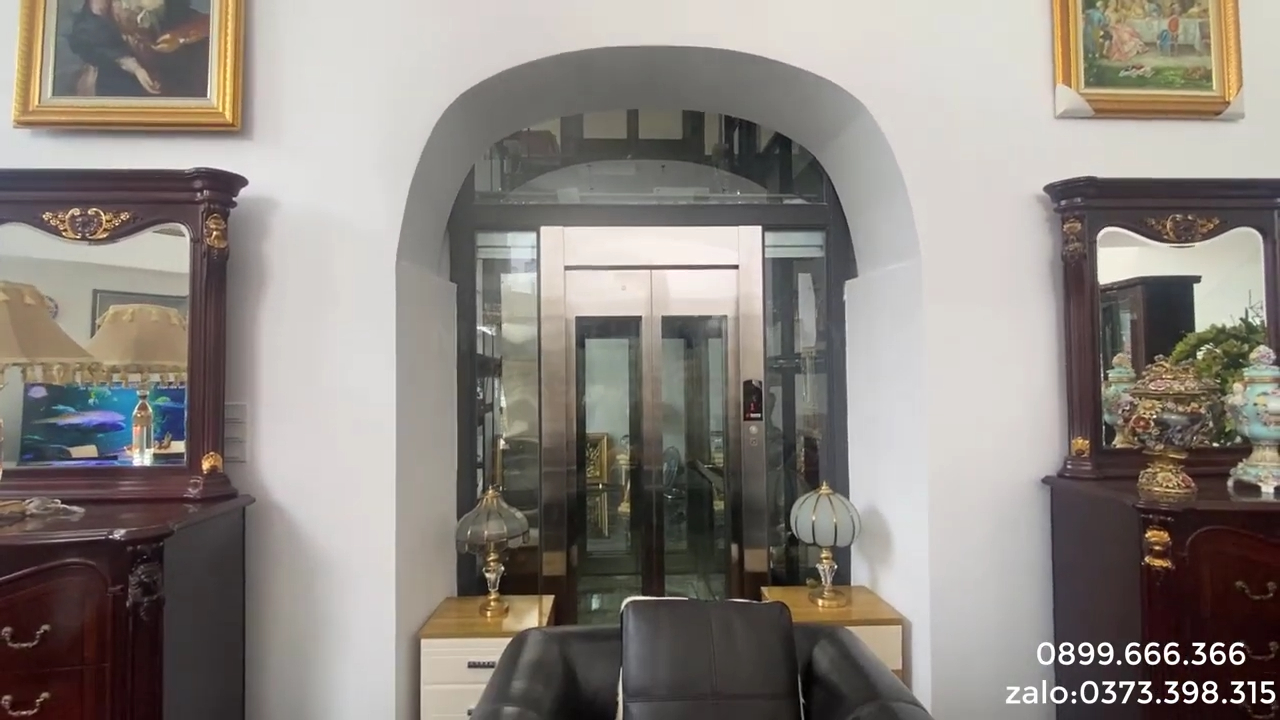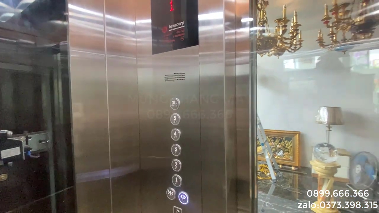 Thang máy này có tải trọng 630kg, về thiết kế có thể phục vụ khoảng 8 đến 9 người cùng lúc. Tuy nhiên điểm đặc biệt ở công trình này là chủ nhà sử dụng thiết kế hai cửa đối diện nhau, tức là cửa mở thông hai phía. Nhiều công trình khác cũng có thiết kế hai cửa nhưng thường đặt vuông góc nhau, ví dụ tầng một mở ở mặt này nhưng các tầng trên lại mở ở mặt khác. Khi thiết kế như vậy thì hố thang sẽ phải nhỏ lại và cabin cũng nhỏ hơn vì phải dành diện tích cho hệ thống cửa tầng và cửa cabin. Còn với thiết kế hai cửa đối diện như ở đây thì không gian cabin vẫn được giữ khá rộng và việc di chuyển cũng thuận tiện hơn.