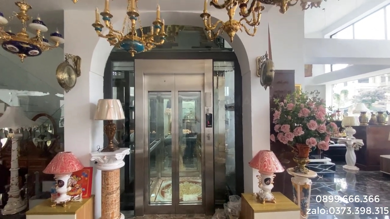 Phần kính sử dụng cho thang máy là kính cường lực do khách hàng lựa chọn. Tấm kính phía trên phải chia thành bốn tấm chính và hai tấm nhỏ ở hai bên để thuận tiện cho việc lắp đặt. Bên trên là lớp kính cường lực khoảng 5 ly, vì vậy việc chia tấm sẽ giúp quá trình thi công và lắp đặt dễ dàng hơn. Khu vực trưng bày ở tầng một cũng có nhiều mẫu đèn chùm châu Âu rất đẹp. Các tầng phía trên còn nhiều mẫu mã nội thất khác như giường, tủ và các bộ sản phẩm trang trí, tuy nhiên do việc sắp xếp chưa hoàn chỉnh nên hôm nay tôi xin phép không quay chi tiết ở các tầng đó.