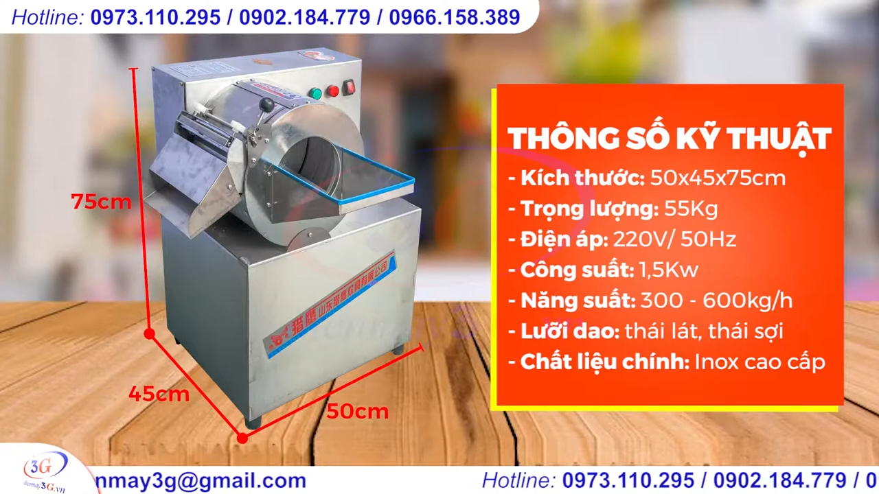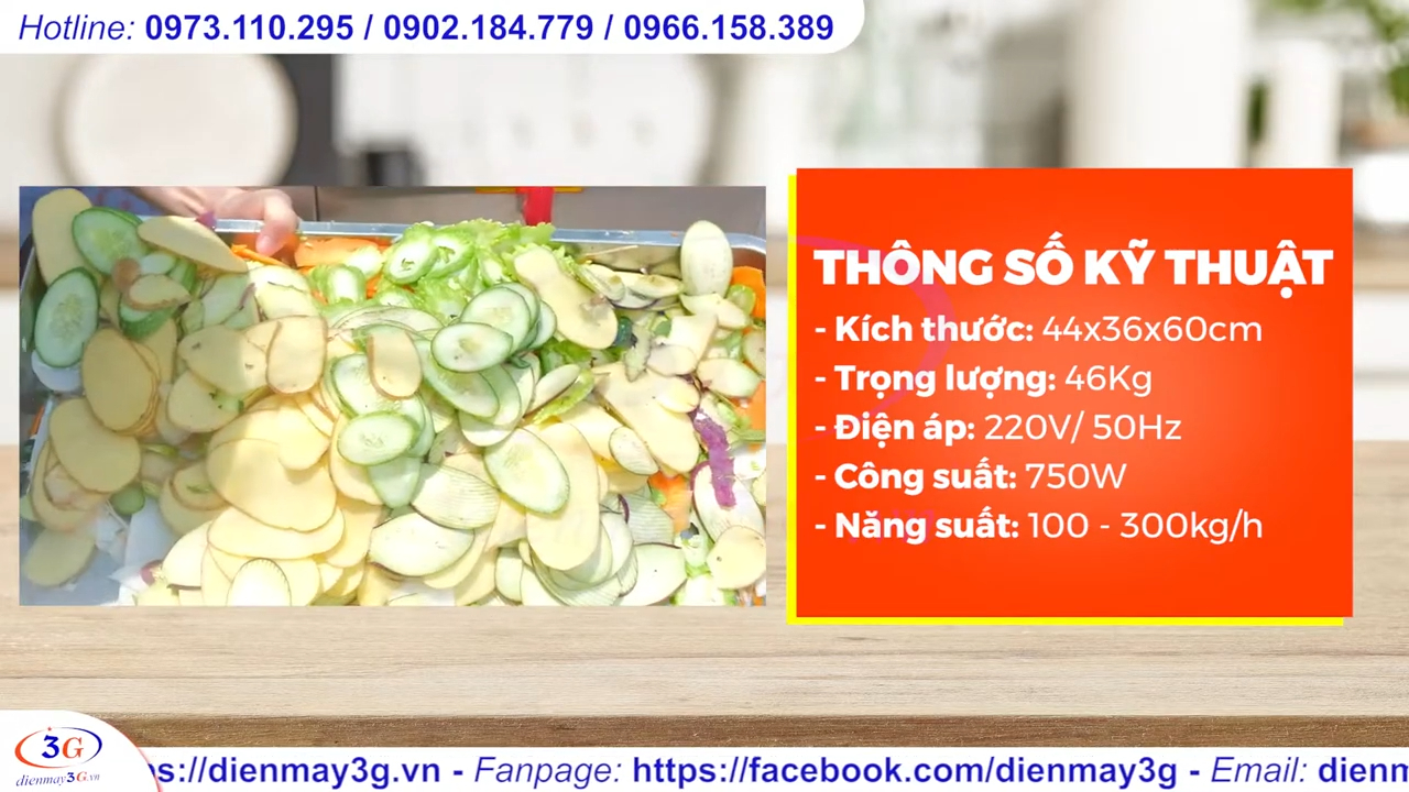 Về thông số kỹ thuật, máy có kích thước khoảng 44 x 36 x 60cm, trọng lượng khoảng 46kg, sử dụng điện áp 220V với công suất khoảng 750W và năng suất đạt từ 100 đến 300kg nguyên liệu mỗi giờ.