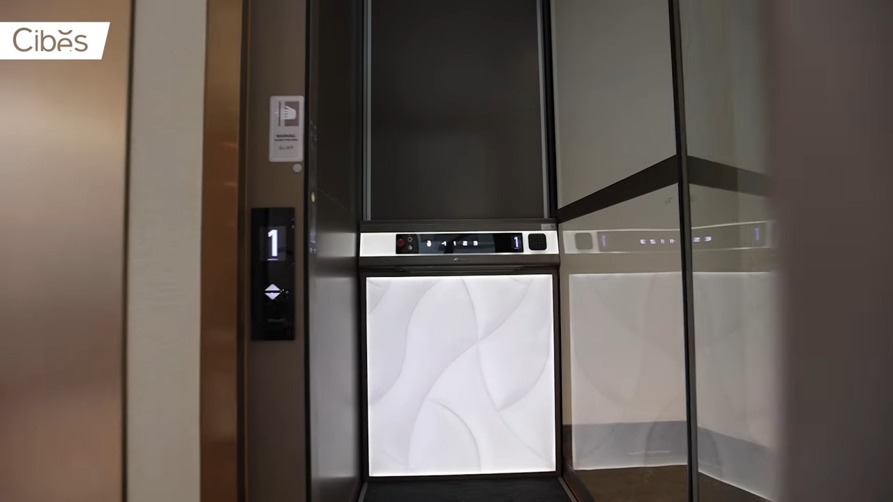 Mẫu thang cuối cùng trong danh sách là Cibes Ecosilent, được nhập khẩu trực tiếp từ Thụy Điển. Chiếc thang này có kích thước sàn khoảng 1100 x 930 mm và kích thước thông thủy khoảng 1520 x 1080 mm. So với những mẫu thang trước, mẫu thang này có thiết kế tối giản hơn với tông màu trắng kem chủ đạo, mang lại cảm giác nhẹ nhàng và tinh tế.