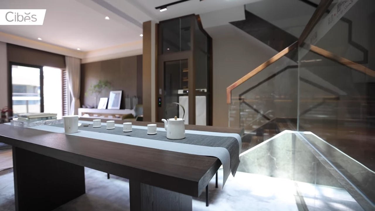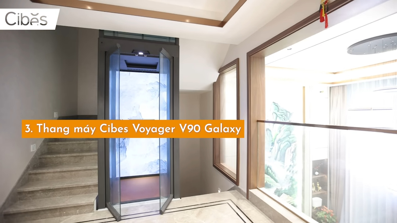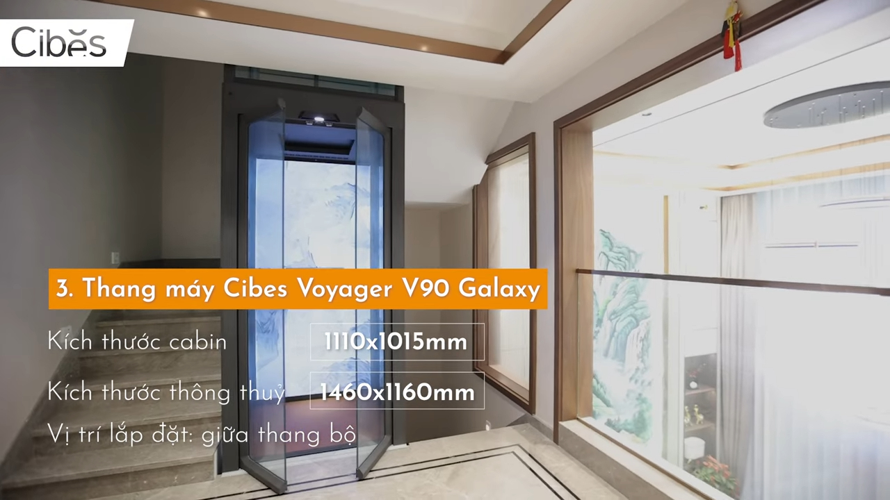 Mẫu thang thứ ba là Cibes HomeLift Galaxy IV-V90 với thiết kế hiện đại và rất nổi bật. Kích thước cabin của mẫu thang này khoảng 1110 x 1015 mm và kích thước thông thủy là 1460 x 1160 mm. Ở công trình này, chủ nhà đã tận dụng khoảng giếng trời nằm giữa cầu thang bộ để lắp đặt thang máy.