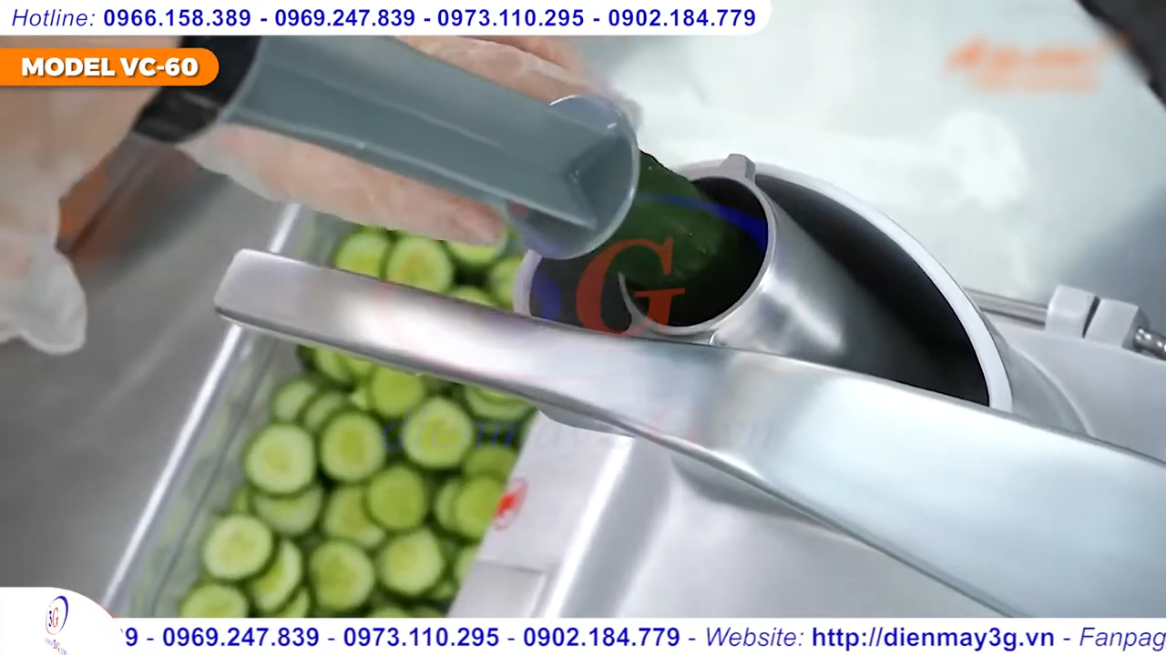 Một trong những dòng máy được sử dụng phổ biến là máy thái rau củ quả VC60. Đây là dòng máy đa năng để bàn, có thể sử dụng 5 bộ dao khác nhau để thực hiện nhiều kiểu cắt như thái lát, thái sợi, thái hạt lựu, thái con chì và nhiều kiểu cắt khác. Máy có kích thước khoảng 50 x 25 x 46 cm, thiết kế gọn gàng nên dễ dàng đặt tại nhiều vị trí trong bếp. Toàn bộ lớp vỏ bên ngoài được làm từ hợp kim nhôm sáng bóng, có khả năng chống ăn mòn và chống gỉ sét. Máy sử dụng động cơ công suất 550W (3/4 HP) mạnh mẽ, đồng thời được trang bị cơ chế tự động ngắt điện giúp ngăn chặn các tình trạng chập cháy, đảm bảo an toàn khi vận hành và có thể cắt được nhiều loại rau củ quả khác nhau.