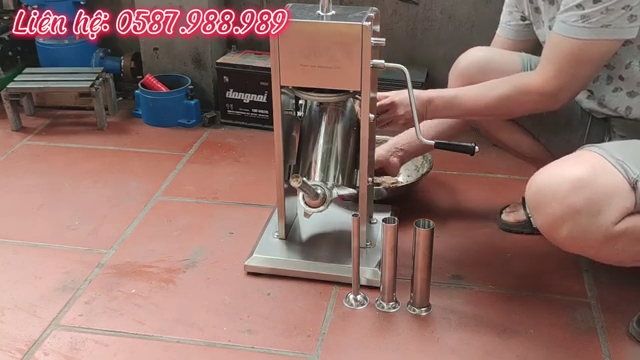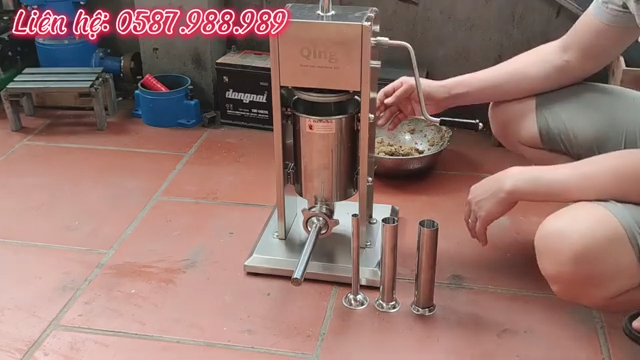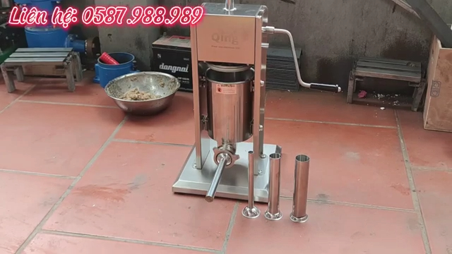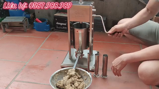 Sau khi đã chuẩn bị xong phần thịt xay, công đoạn tiếp theo là sử dụng máy đùn xúc xích để đưa hỗn hợp thịt vào vỏ xúc xích hoặc vỏ lạp sườn. Đối với các cơ sở sản xuất nhỏ và vừa, người dùng có thể lựa chọn các dòng máy đùn xúc xích có dung tích khoảng 7 lít, 10 lít hoặc 15 lít tùy theo nhu cầu sản xuất. Các máy này thường được chế tạo hoàn toàn bằng inox dày, rất bền bỉ và đảm bảo vệ sinh thực phẩm. Thiết kế chân máy chắc chắn giúp máy đứng vững trong quá trình vận hành, hạn chế rung lắc khi sử dụng. Tốc độ đùn có thể điều chỉnh linh hoạt để phù hợp với từng loại nguyên liệu, giúp quá trình nhồi xúc xích diễn ra thuận lợi và cho ra thành phẩm đều đẹp. Máy còn đi kèm nhiều đầu đùn với kích thước khác nhau để người dùng lựa chọn phù hợp với từng loại xúc xích hoặc lạp sườn cần sản xuất.