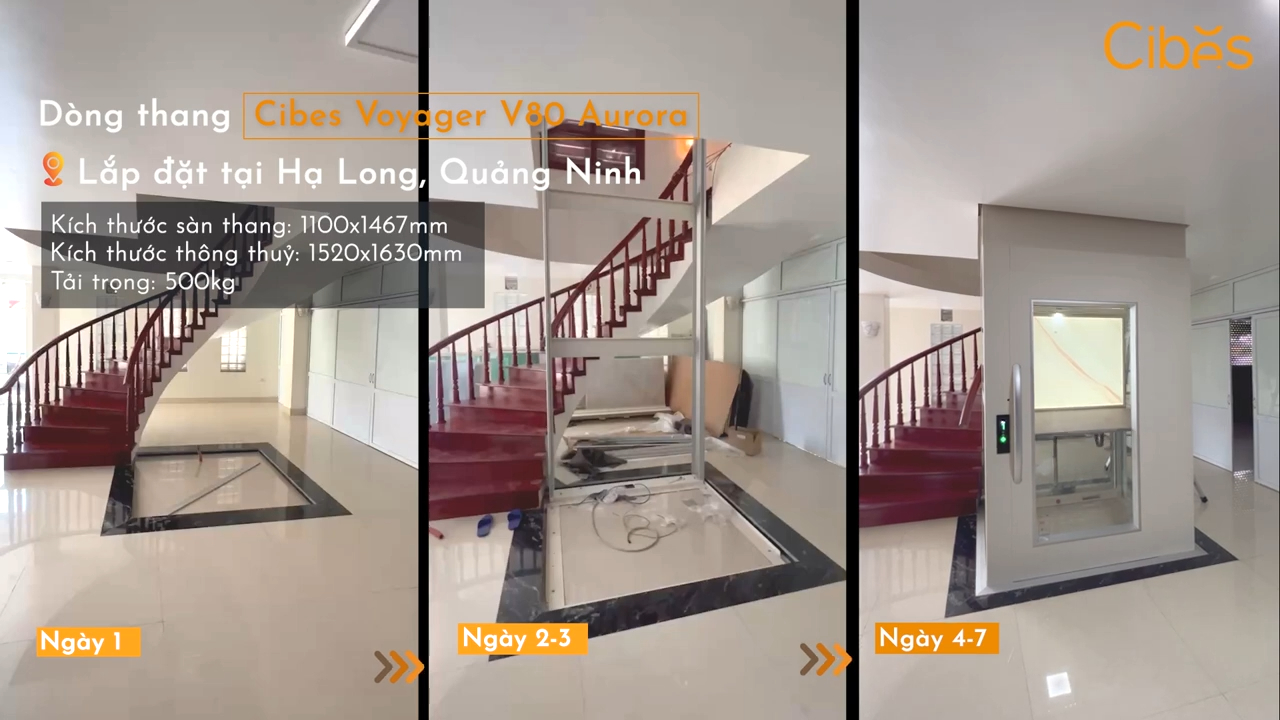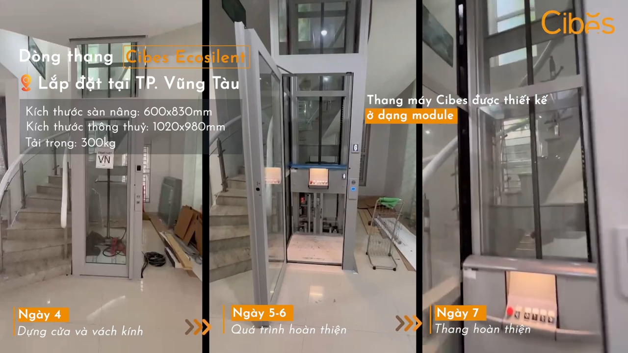 Với mỗi công trình, Cibes chỉ cần từ 7 đến 10 ngày để hoàn thiện lắp đặt và trả lại không gian sinh hoạt cho gia đình, cùng với một chiếc thang máy cực kỳ tiện nghi và chất lượng. Sau khi lắp đặt, ngôi nhà cũng trở nên hiện đại và lung linh hơn rất nhiều. Đầu tiên là chiếc thang máy mini Cibes EcoSilent tại thành phố Vũng Tàu, được lắp đặt tại vị trí hẹp giữa cầu thang bộ với kích thước chỉ khoảng 1 mét vuông. Nếu như thời gian lắp đặt hoàn thiện một chiếc thang máy truyền thống thường rơi vào khoảng 20 đến 30 ngày thì đối với thang máy Cibes chỉ cần từ 7 đến 10 ngày.