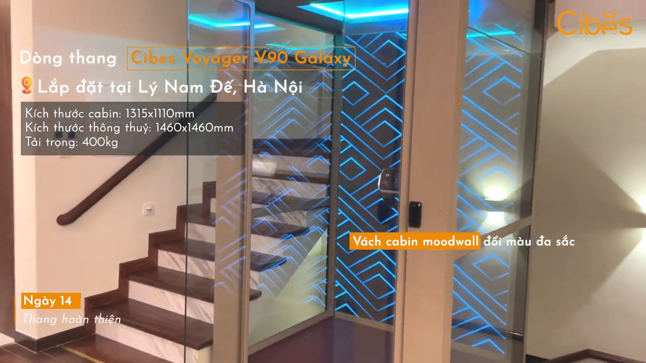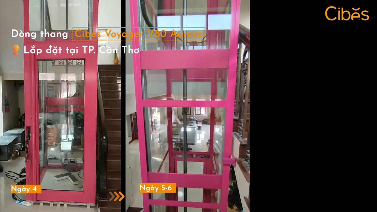 Và cuối cùng trong video ngày hôm nay là chiếc thang máy cabin Cibes Voyager V90 Galaxy. Đối với các dòng thang máy cabin, quá trình lắp đặt sẽ lâu hơn một chút so với dòng thang sàn nâng. Tổng thời gian lắp đặt thường từ 10 đến 14 ngày nếu công trình có nhiều điểm dừng. Tuy nhiên sau khi hoàn thiện, chiếc thang chắc chắn sẽ khiến bạn ấn tượng bởi thiết kế hiện đại và sang trọng.
