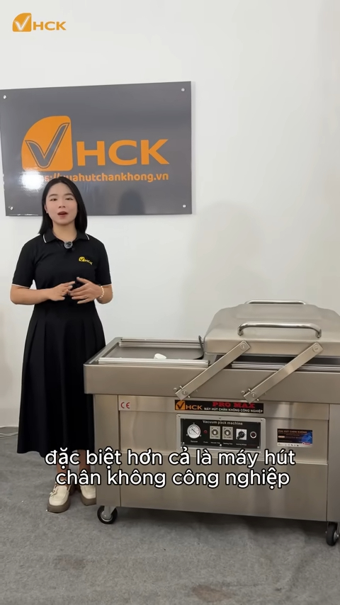 Máy hút chân không công nghiệp là loại máy chuyên dụng cho các cơ sở sản xuất lớn, cần hút chân không với số lượng lớn thực phẩm mỗi ngày. Máy DHV400 là một dòng máy công nghiệp phổ biến với công suất mạnh mẽ, có thể hút các loại thực phẩm như thịt sống, hải sản, đồ khô, hoặc thực phẩm đông lạnh. Máy có khả năng hút 4-6 túi cùng lúc, rất thích hợp cho các cơ sở yêu cầu năng suất cao. Quá trình hút rất nhanh, chỉ mất khoảng 20 giây cho mỗi túi, và mối hàn rất đều, chắc chắn.