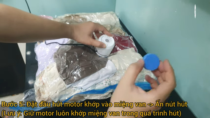 Sau khi cho quần áo vào túi và kéo kín khóa zip, người dùng mở nắp van hút trên túi rồi đặt đầu hút của máy vào đúng vị trí van. Khi bật máy, không khí bên trong túi sẽ được hút ra ngoài và túi bắt đầu xẹp xuống. Trong quá trình hút, có thể dùng tay ép nhẹ túi để giúp không khí thoát ra nhanh hơn. Khi túi đã được hút xẹp hoàn toàn, chỉ cần đóng chặt nắp van lại để ngăn không khí lọt vào bên trong. Lúc này túi sẽ giữ nguyên trạng thái nén và có thể dễ dàng cất vào tủ, vali hoặc hộp lưu trữ.