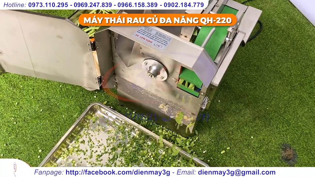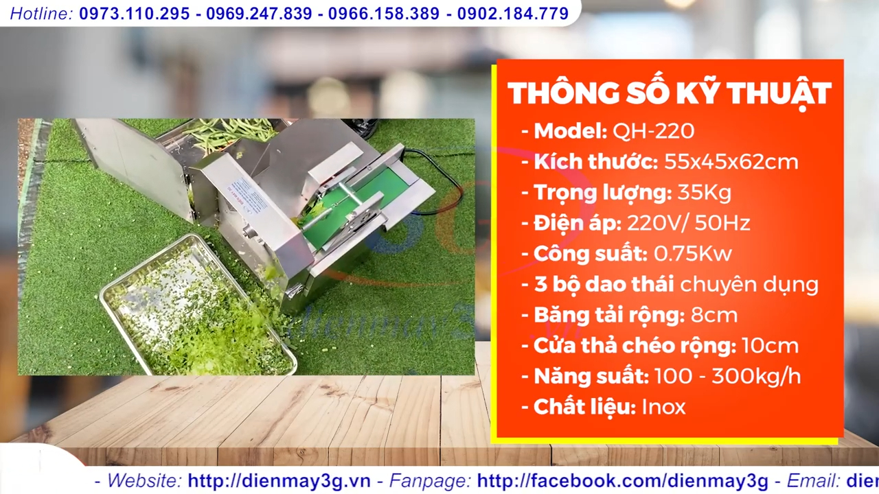 Về thông số kỹ thuật, model QH220 có kích thước 55 x 45 x 62 cm, trọng lượng 35 kg. Điện áp sử dụng 220V – 50Hz, công suất 750W. Máy đi kèm 3 bộ dao cắt chuyên dụng, băng tải rộng 8 cm và cửa thả chéo rộng 10 cm. Toàn bộ phần khung và vỏ máy được làm bằng inox không gỉ, đảm bảo độ bền và an toàn vệ sinh thực phẩm.
