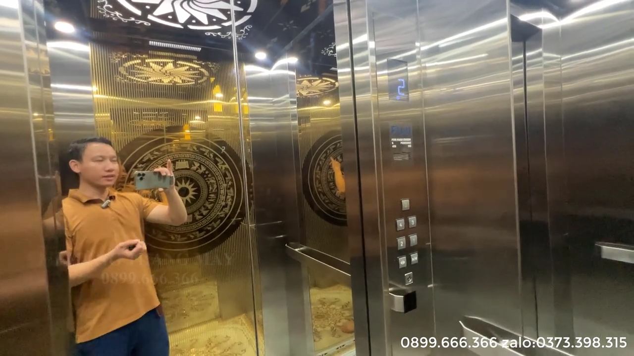 - Cửa thang tầng 1 sử dụng inox gương vàng họa tiết trống đồng, mang ý nghĩa phong thủy tốt và thể hiện sự sang trọng ngay từ khu vực phòng khách hoặc bếp.
