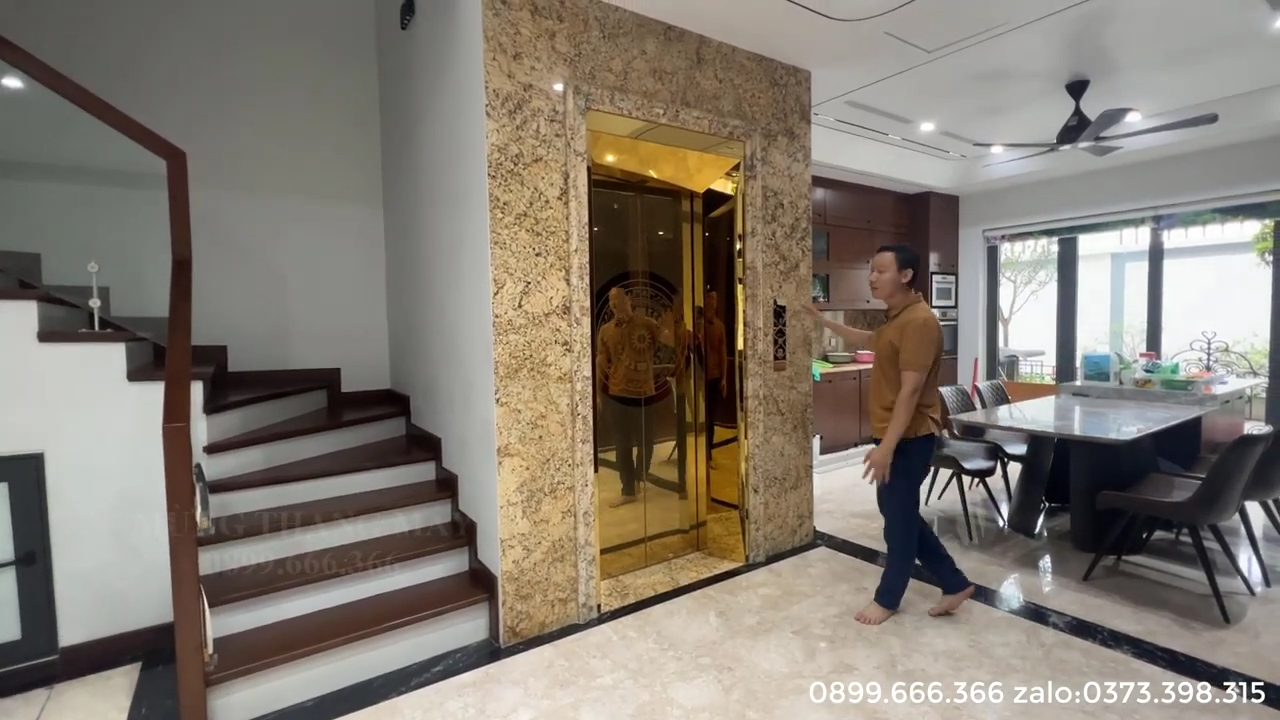 Chào anh chị, nhabephiendai.net rất vinh dự được giới thiệu chi tiết về mẫu thang máy gia đình tiêu chuẩn 400kg vừa hoàn thiện và bàn giao. Công trình sử dụng kết cấu hố thang bê tông tường gạch truyền thống, được thiết kế tinh tế để hài hòa với không gian biệt thự sân vườn sang trọng có hồ cá Koi. Mẫu thang máy này không chỉ đảm bảo yếu tố kỹ thuật, vận hành êm ái mà còn được chăm chút kỹ lưỡng về thẩm mỹ để trở thành một điểm nhấn kiến trúc trong tổng thể ngôi nhà.