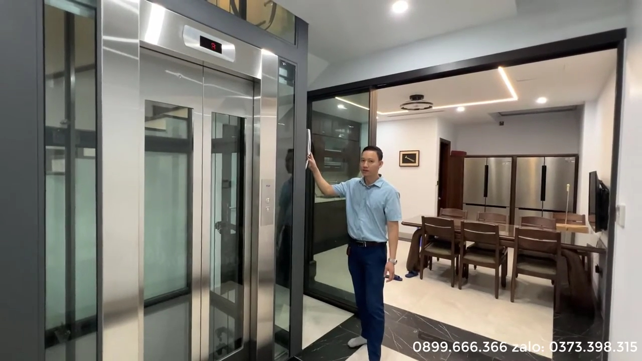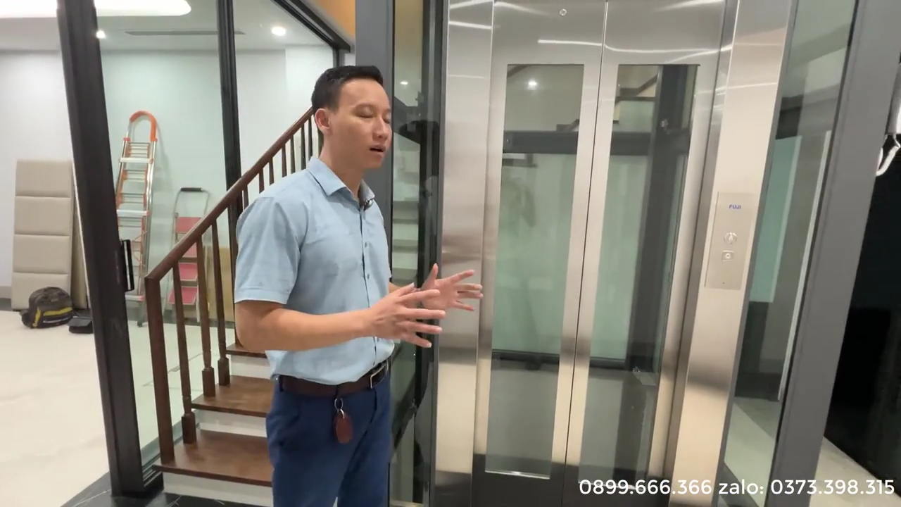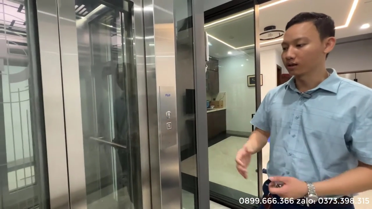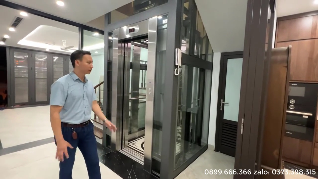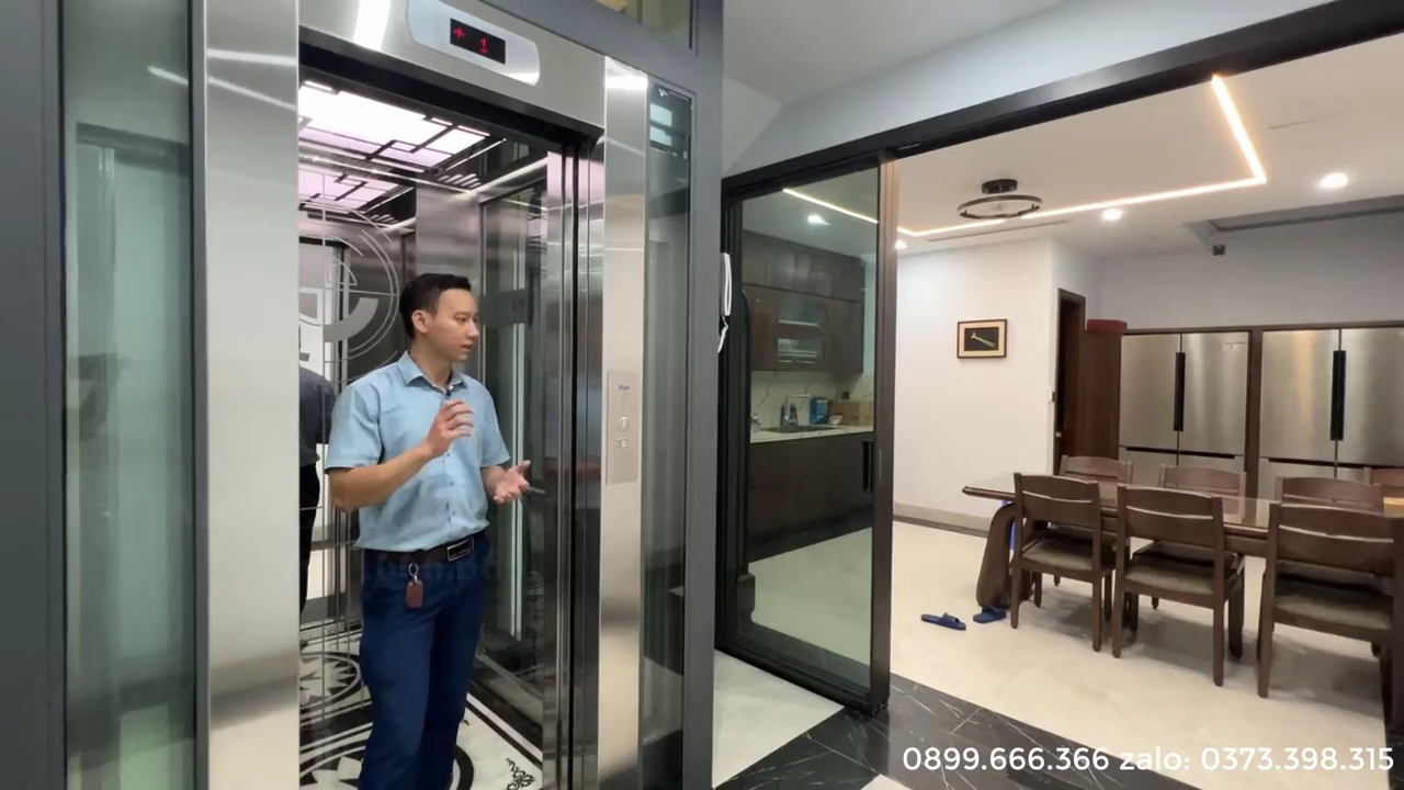 Một ưu điểm lớn của phương án khung thép kính là khả năng tiết kiệm diện tích đáng kể so với hố thang bê tông truyền thống. Với cùng kích thước phủ bì, khung thép chỉ chiếm khoảng vài centimet mỗi cạnh, giúp lòng hố rộng hơn khoảng 15 đến 20cm. Khoảng không gian tăng thêm này giúp cabin rộng rãi hơn, tạo cảm giác thoải mái khi sử dụng. Ngoài ra, phương án thi công khung thép cũng giúp quá trình lắp đặt diễn ra nhanh chóng, ít phát sinh bụi bẩn và phù hợp với cả những công trình cải tạo. Phần nội thất cabin được hoàn thiện theo phong cách hiện đại, sử dụng vật liệu inox sọc nhuyễn làm chủ đạo. Đây là loại vật liệu bền bỉ, ít bám vân tay và dễ dàng phối hợp với nhiều phong cách nội thất khác nhau trong nhà. Toàn bộ khu vực cửa tầng được lắp đặt khung bao bản rộng khoảng 150mm, giúp che giấu hoàn toàn hệ thống dây tín hiệu và các chi tiết cơ khí bên trong. Nhờ vậy, mặt sảnh chờ trở nên gọn gàng và sang trọng hơn.