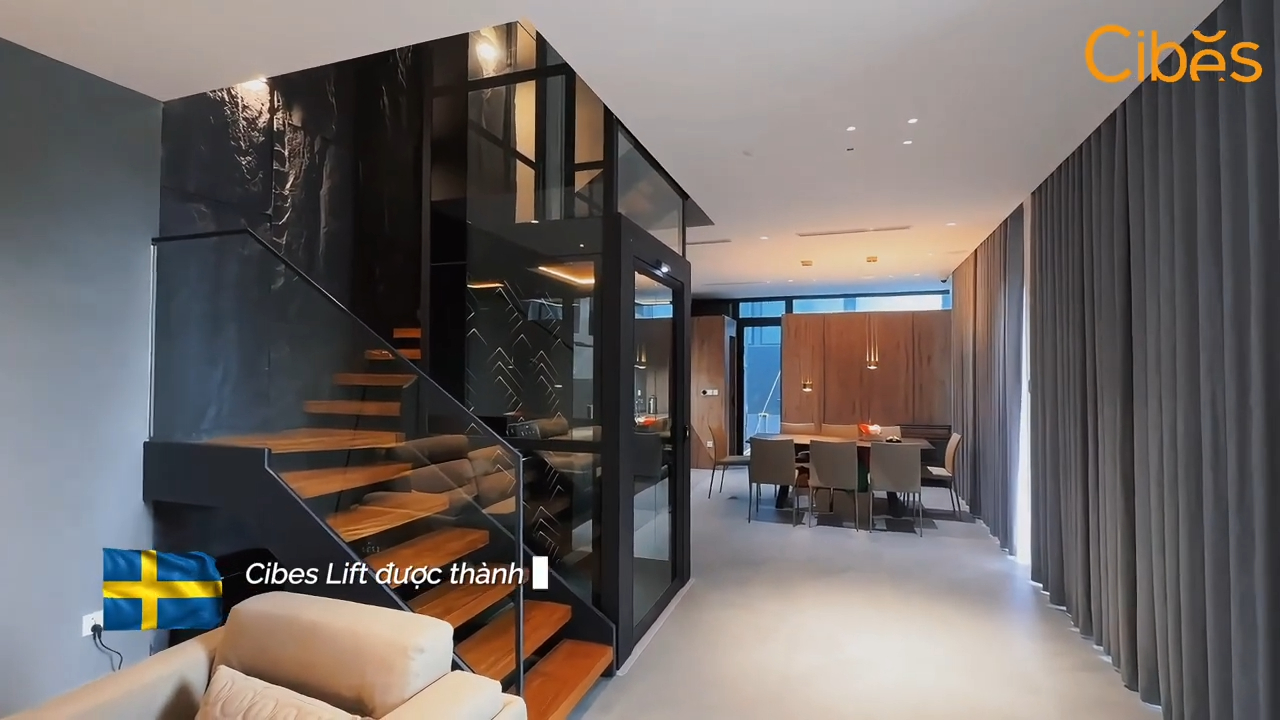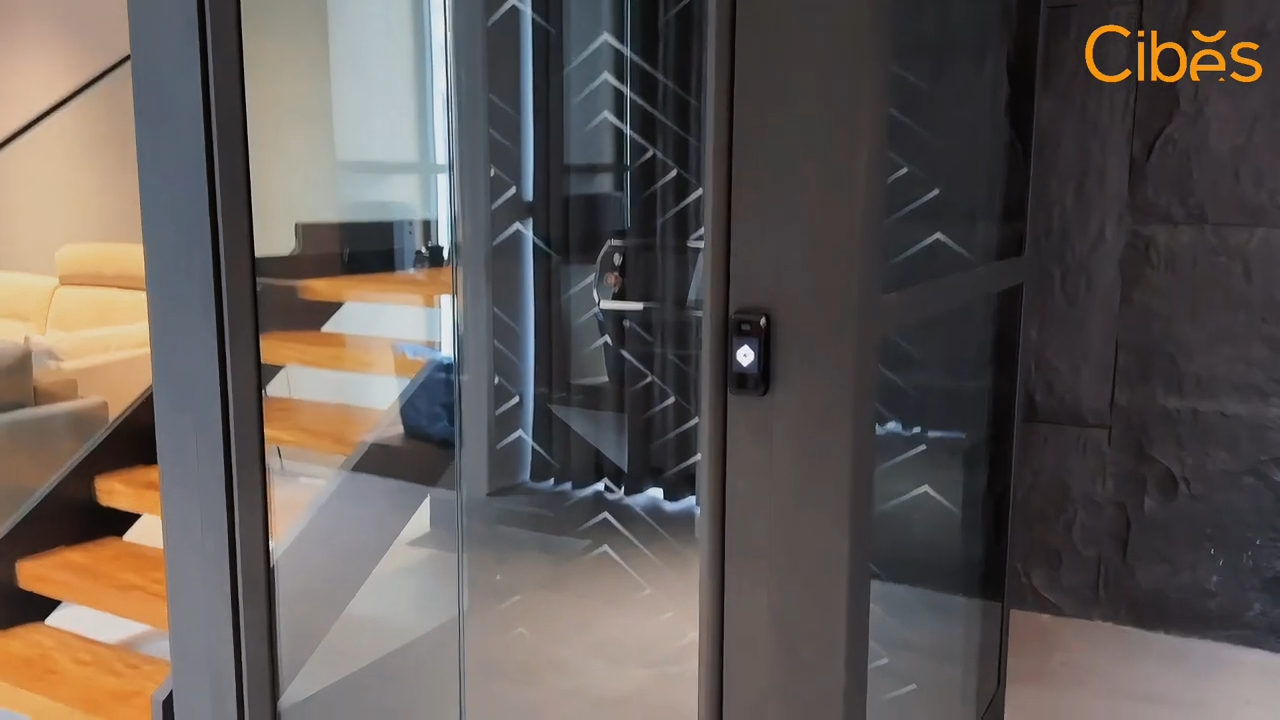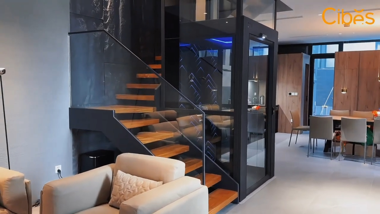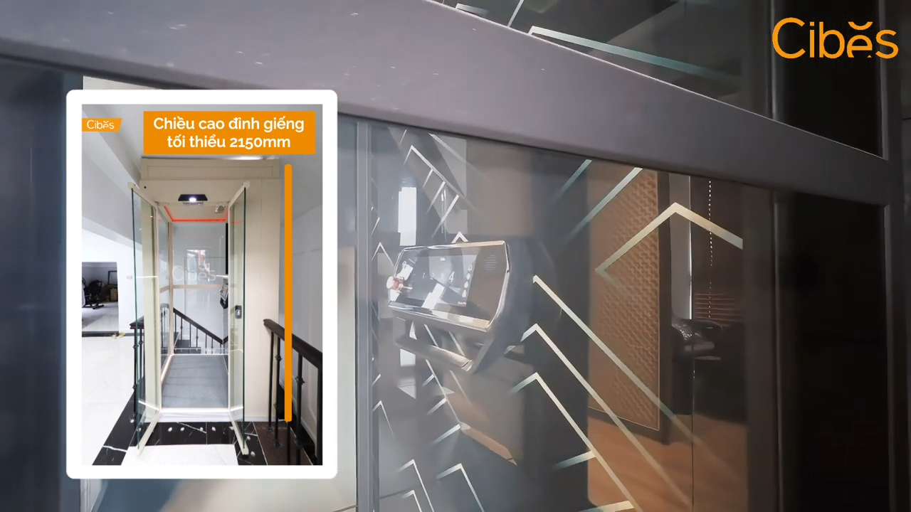 Thang máy Sibets sử dụng thiết kế bốn mặt kính nên khi lắp ở vị trí giữa cầu thang bộ, chúng ta có thể nhìn được toàn bộ không gian của ngôi nhà. Phần kính sử dụng ở đây là kính cường lực an toàn hai lớp, nghĩa là gồm hai lớp kính và một lớp phim ở giữa. Lý do sử dụng loại kính này là để đảm bảo an toàn. Trong trường hợp kính bị vỡ thì các mảnh kính sẽ bám vào lớp phim ở giữa, không rơi ra ngoài gây nguy hiểm cho người sử dụng.